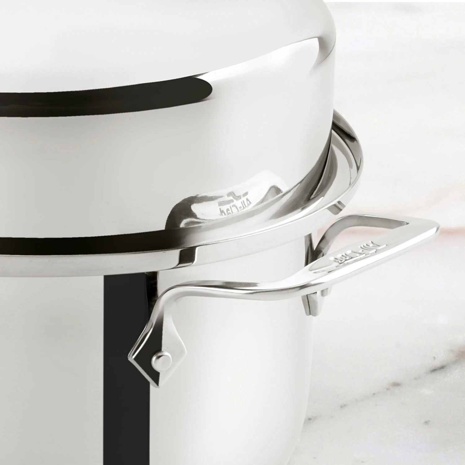 - Complete with tight-fitting polished stainless steel domed lid with riveted handles