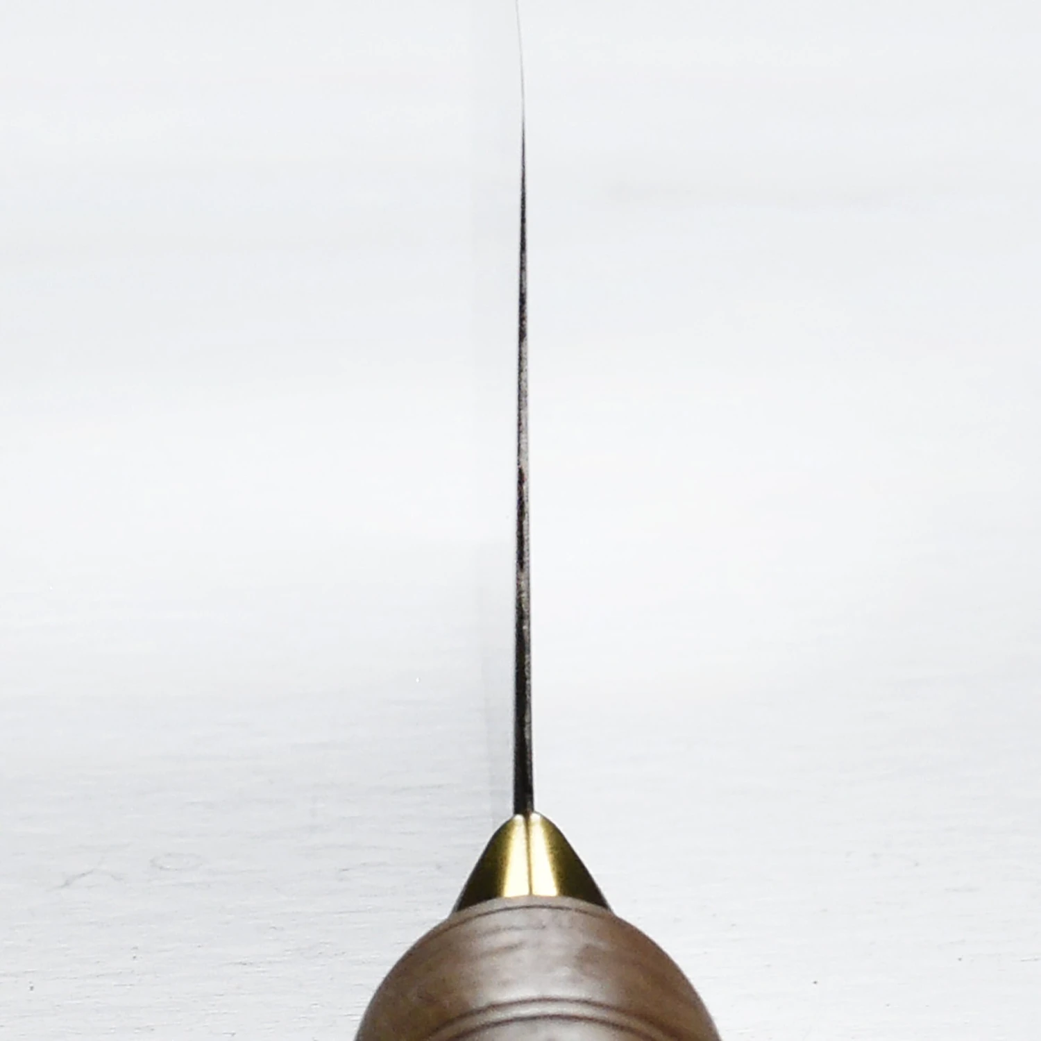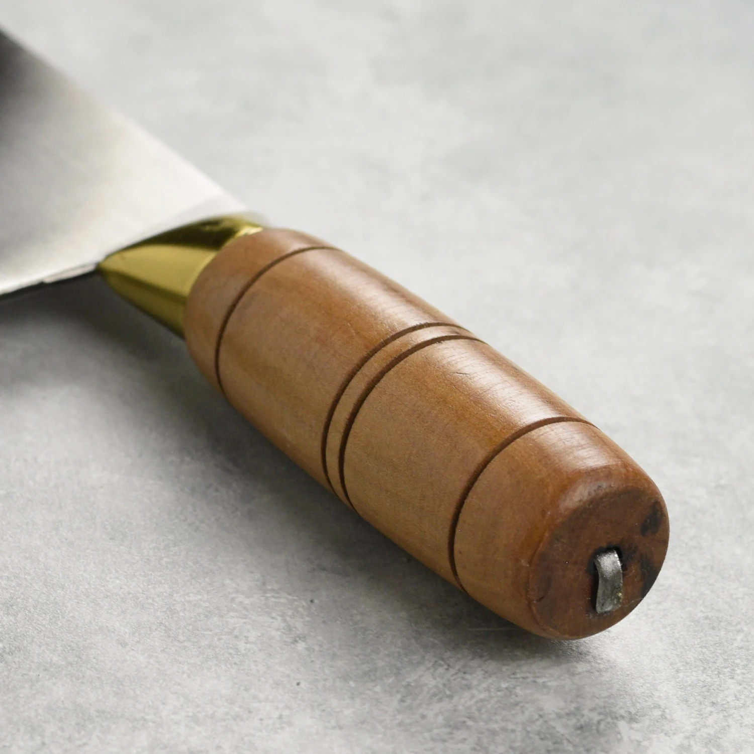 - Barrel shaped wood handle with brass bolster and stick tang that’s folded over at the handle end