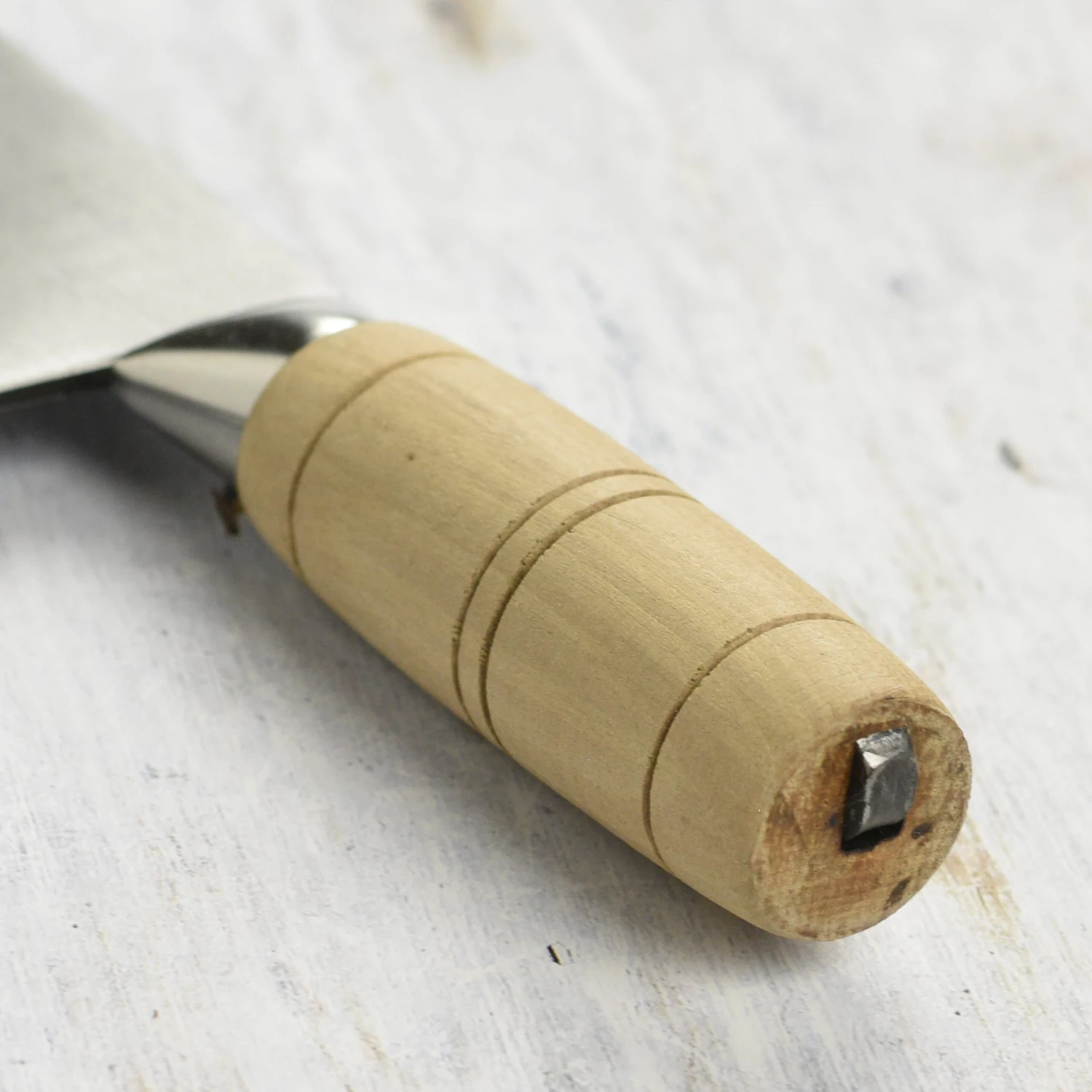 - Barrel shaped wood handle with metal bolster and stick tang that’s folded over at the handle end