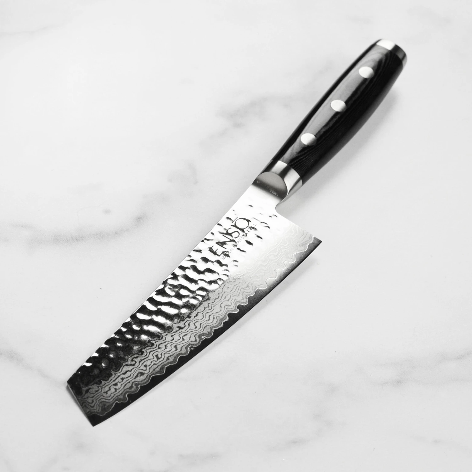 - 37-layer stainless Damascus blades with hammered (tsuchime) finish