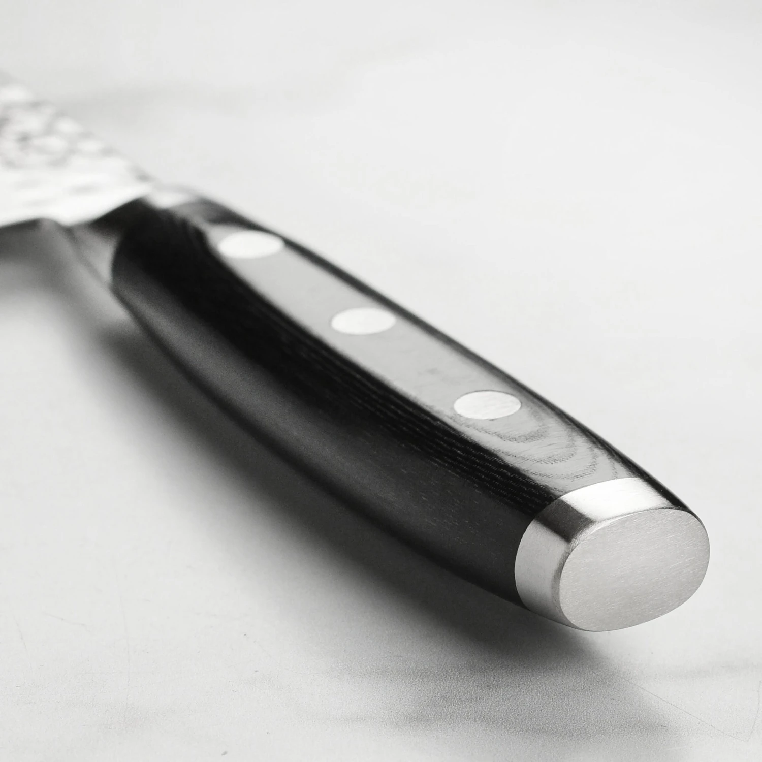 - 37-layer stainless Damascus blades with hammered (tsuchime) finish