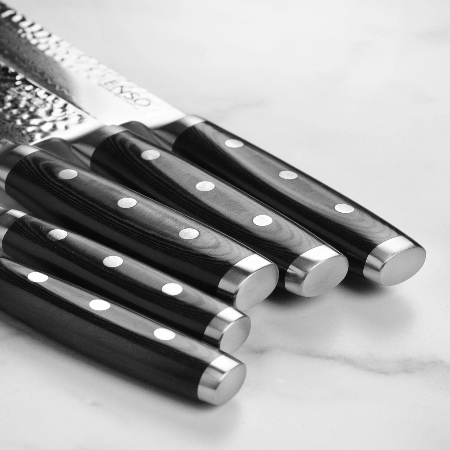 - 37-layer stainless Damascus blades with hammered (tsuchime) finish