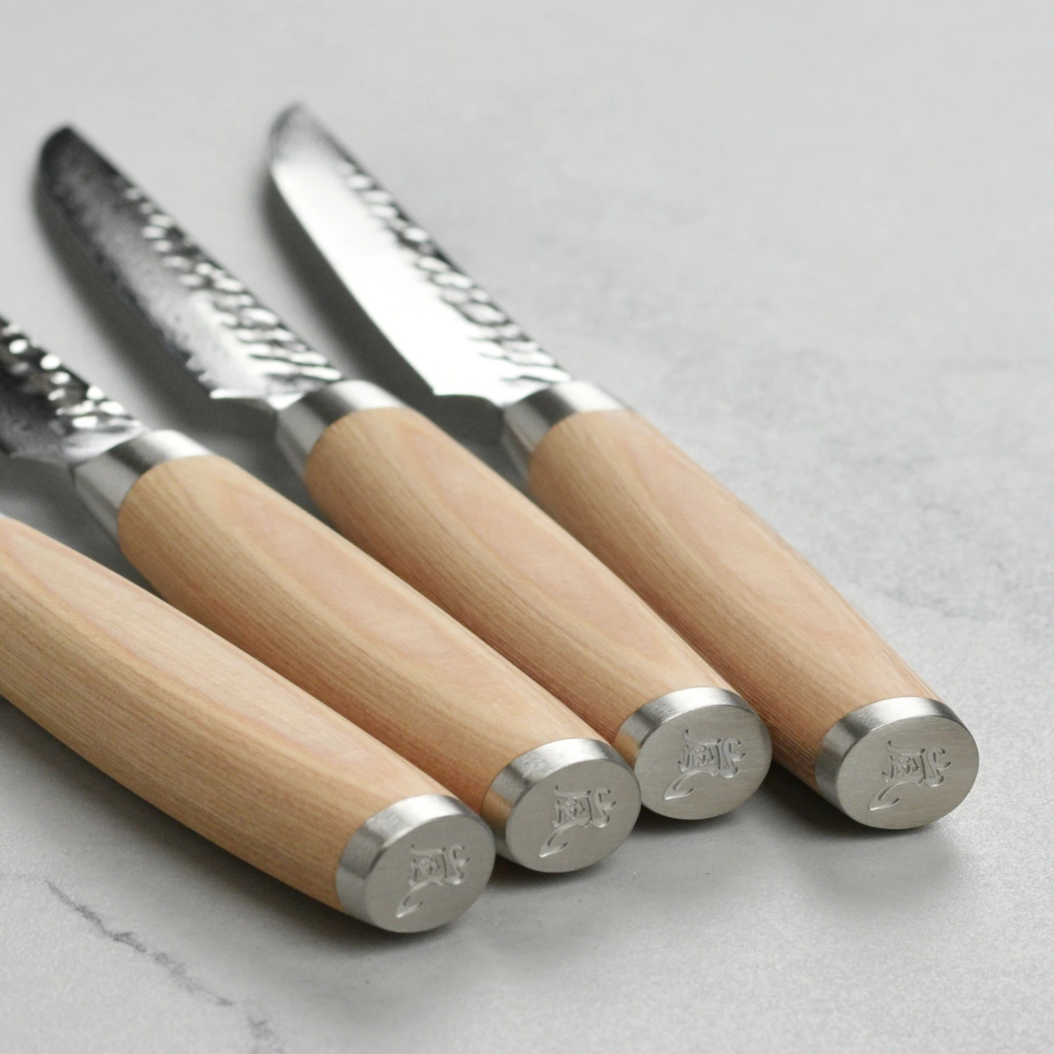 - 37-layer stainless Damascus blades with hammered (tsuchime) finish