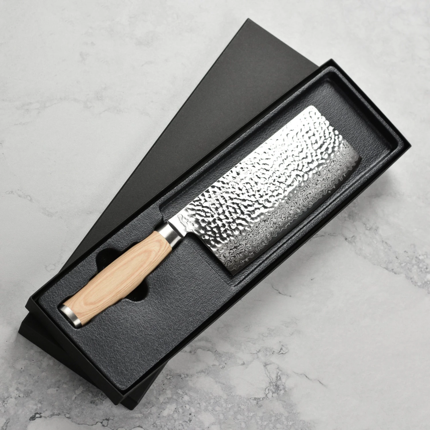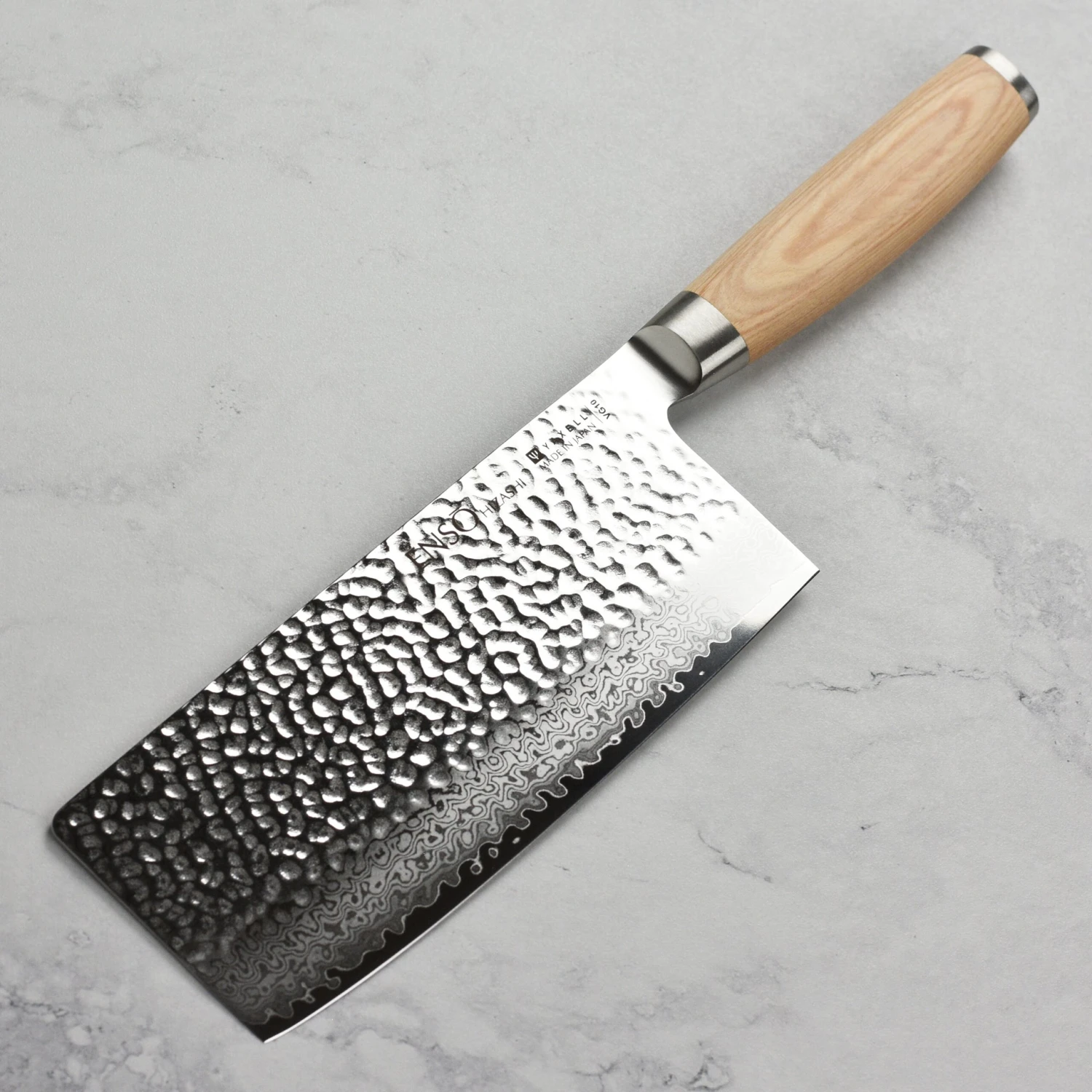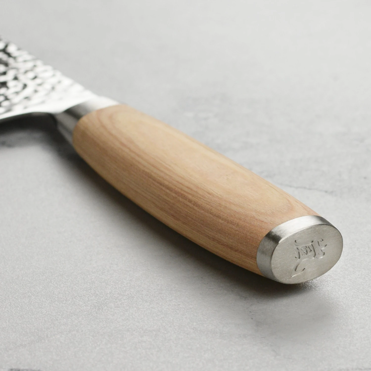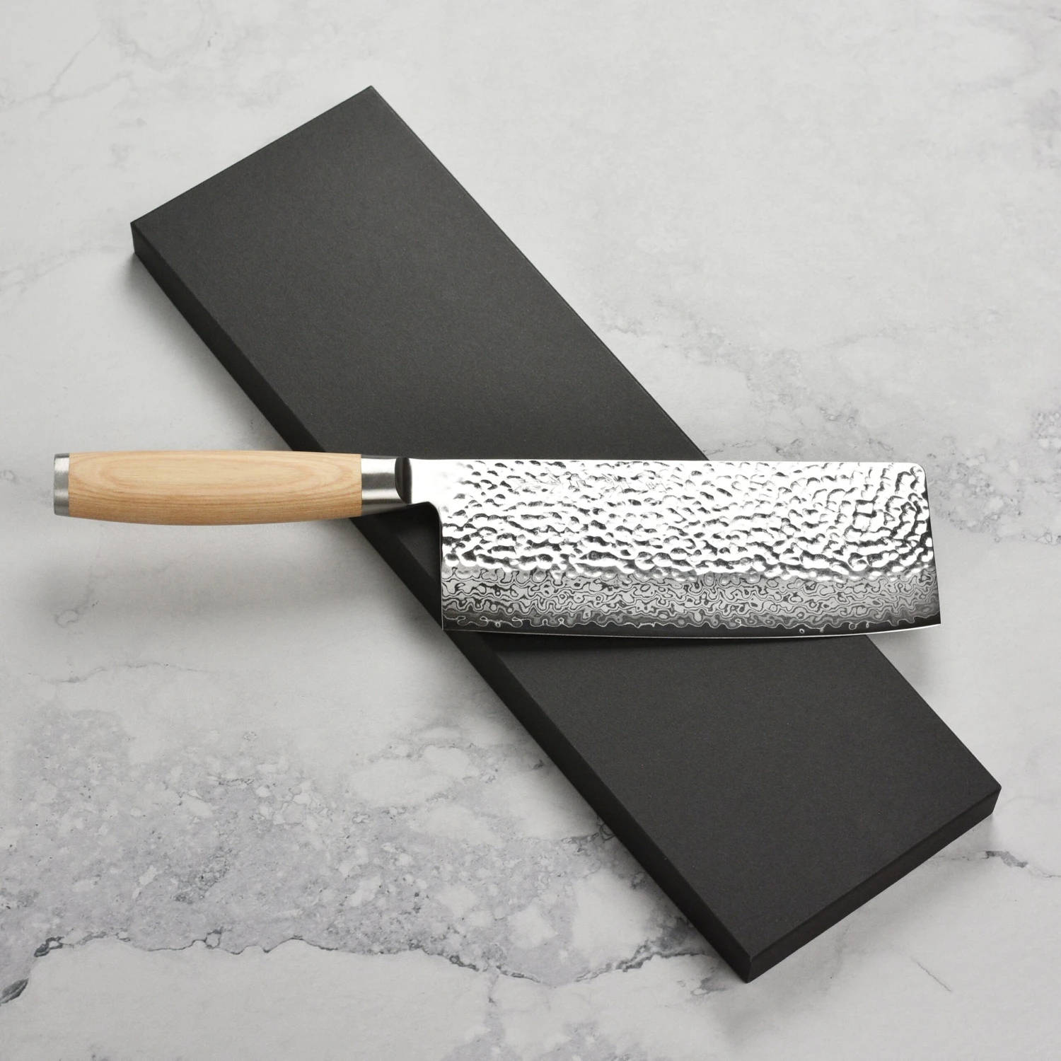 - 37-layer stainless Damascus blades with hammered (tsuchime) finish