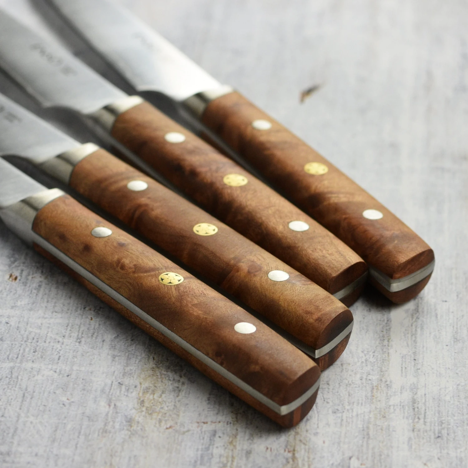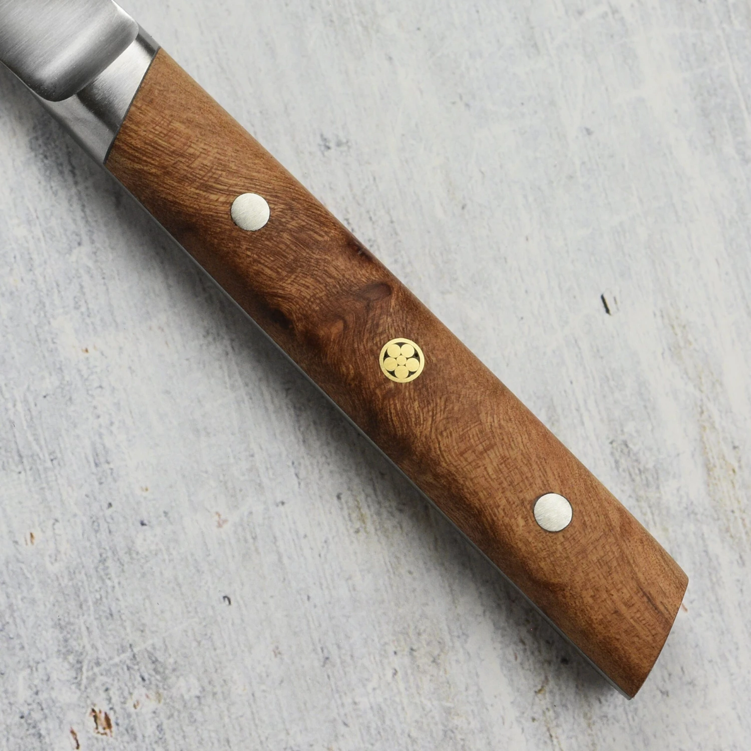 - Beautifully crafted triple riveted full-tang handles made of birchwood burl, hand picked in a darker color and grain, and featuring a decorative mosaic middle rivet