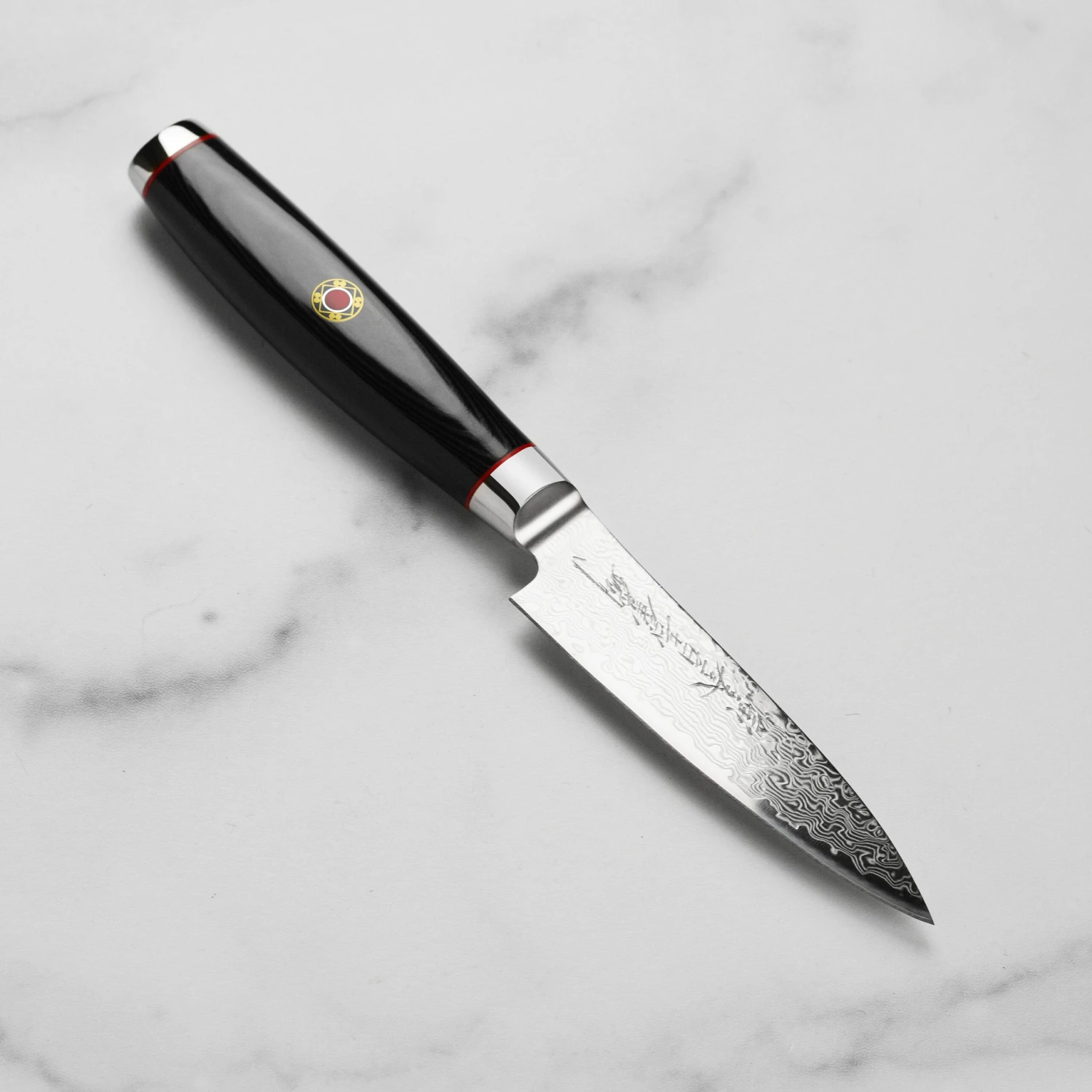 - Black canvas micarta handle with 18/10 stainless steel bolster and engraved end cap, red spacers and Samurai Crest