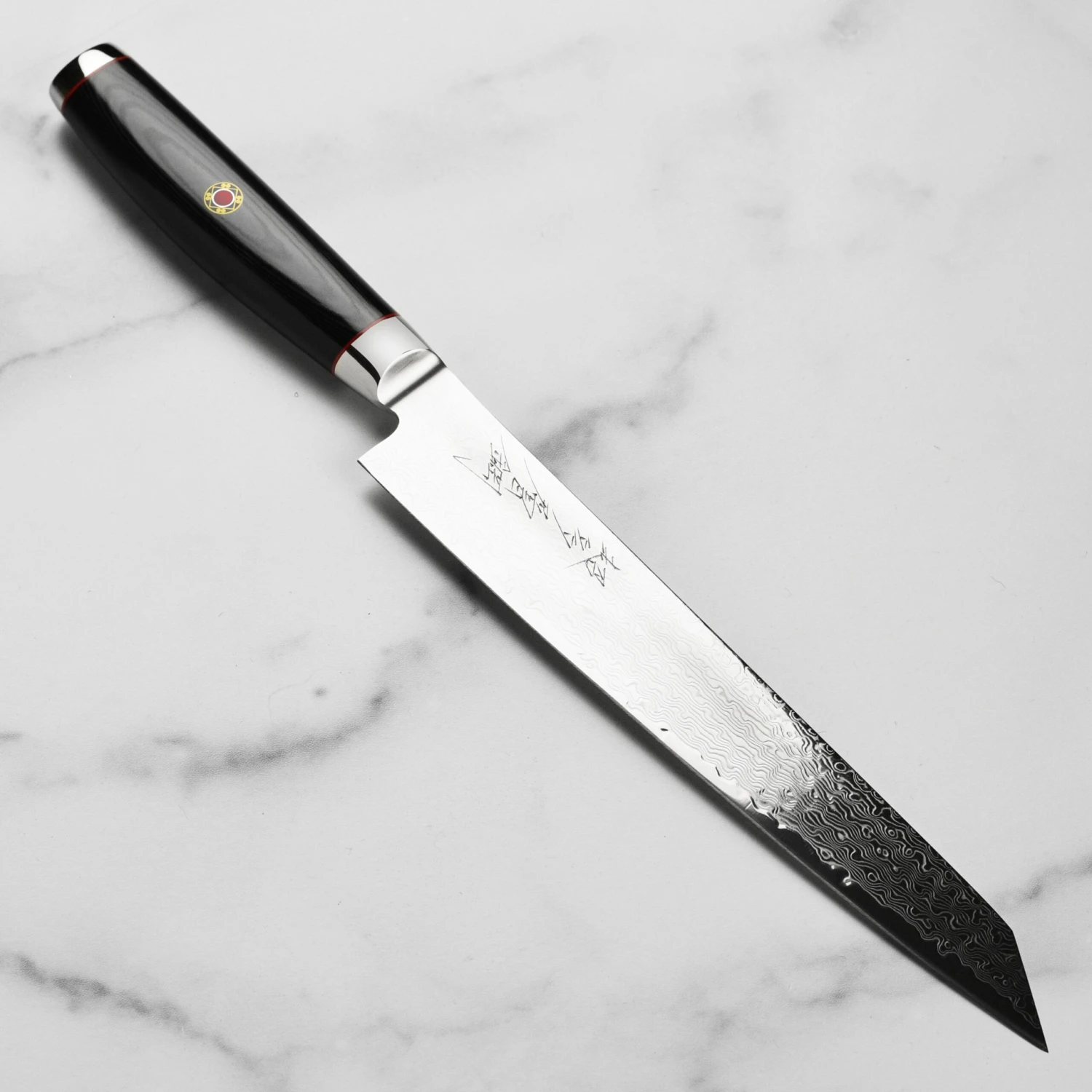 - 101 layer stainless steel Damascus construction with SG2 steel core; Japanese kanji is hand engraved on the blade