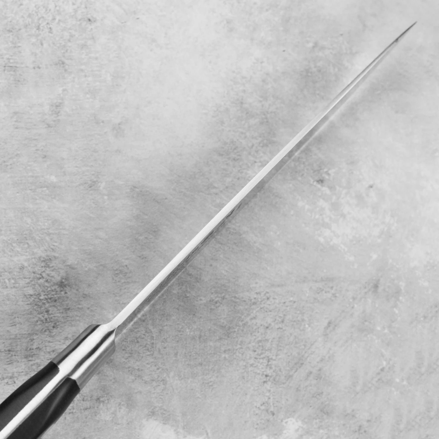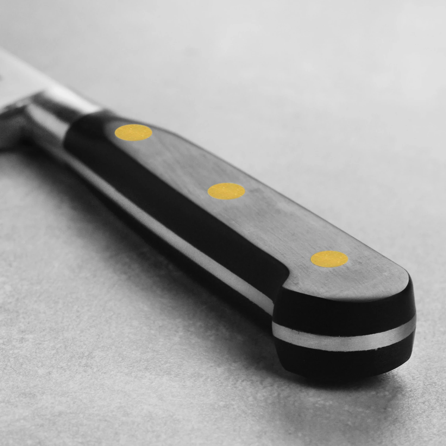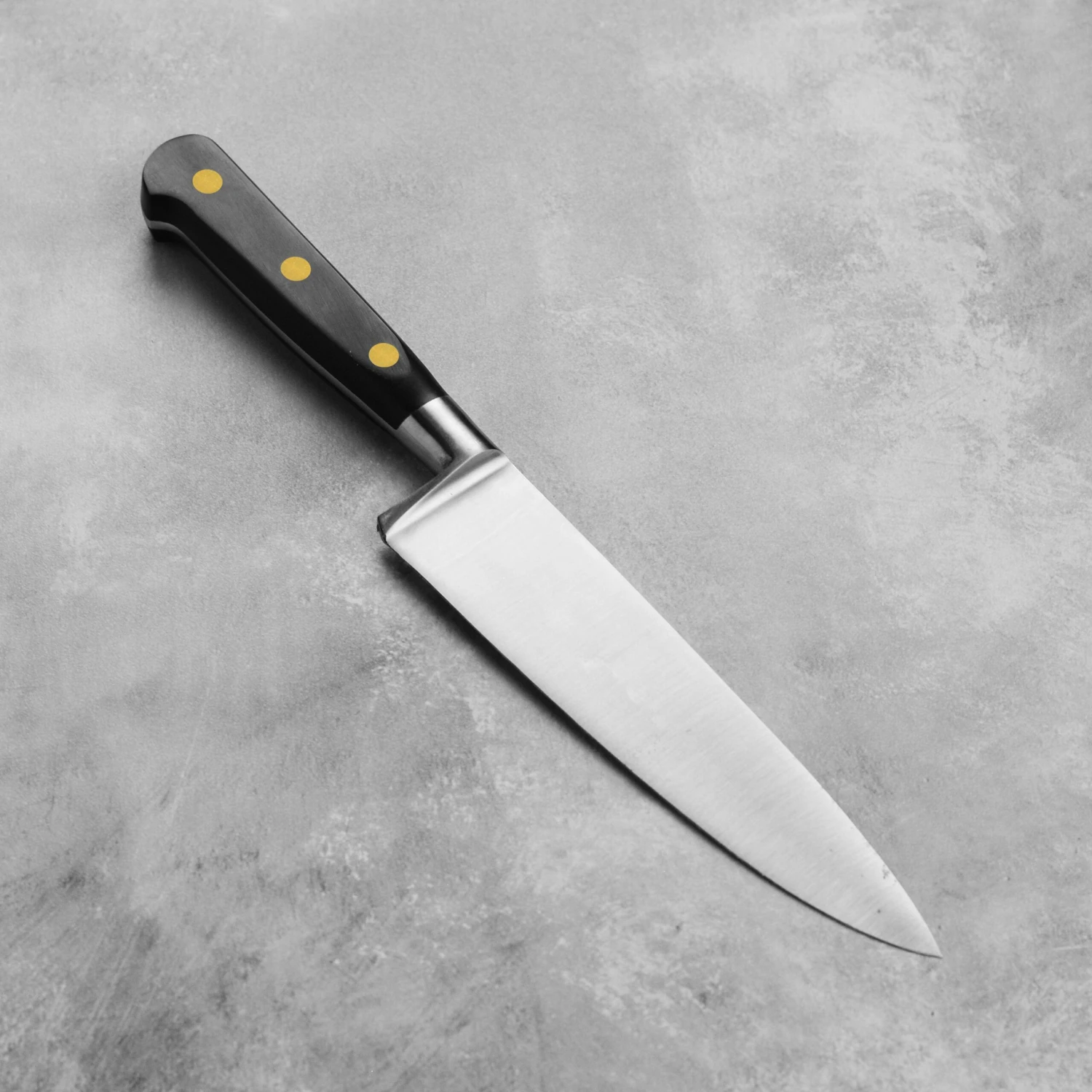 - Full-tang with rounded classic French style bolster, durable POM handle and brass rivets