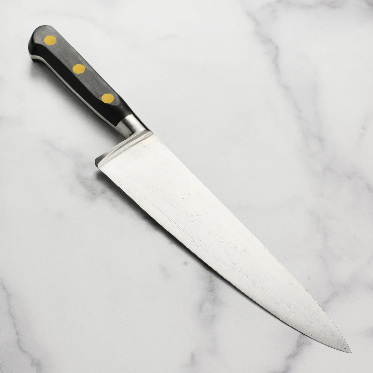 - Full-tang with rounded classic French style bolster, durable POM handle and brass rivets