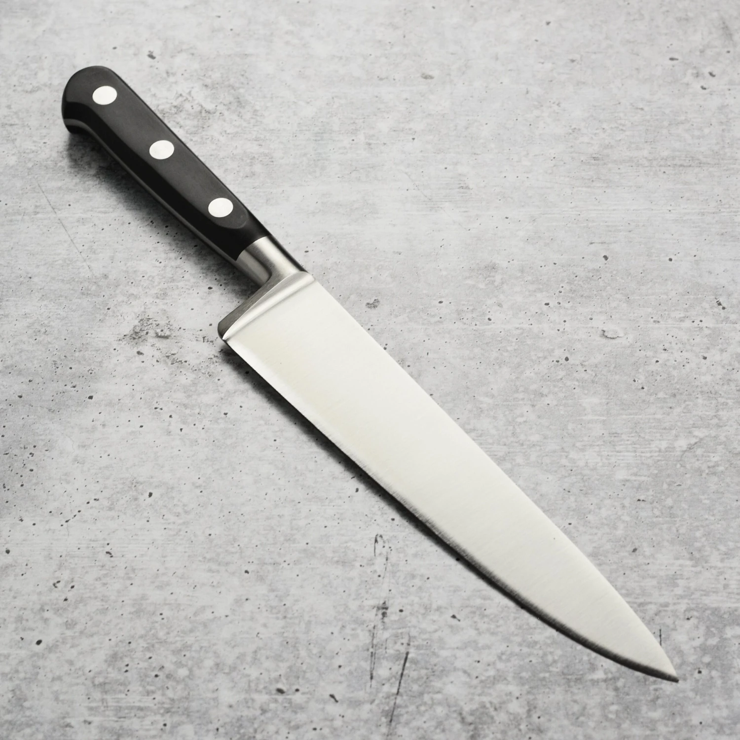 - Full-tang with rounded classic French style bolster, POM handle and stainless steel rivets