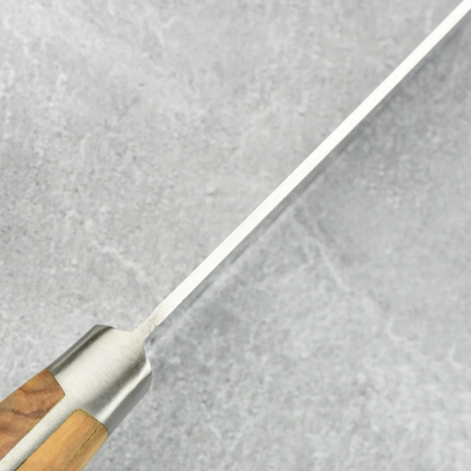 - Full-tang with rounded classic French style bolster, Olive wood handle and stainless steel rivets