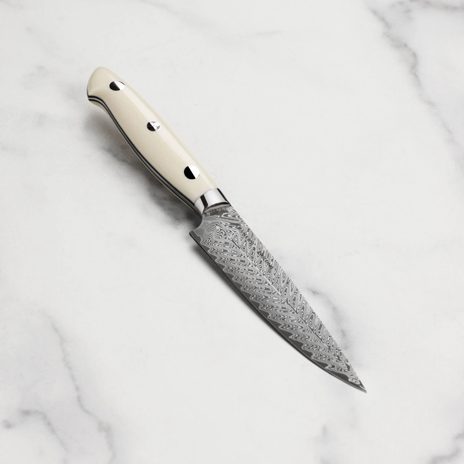 - Full tang tapered, triple riveted, white linen micarta handle with signature decorative center pin