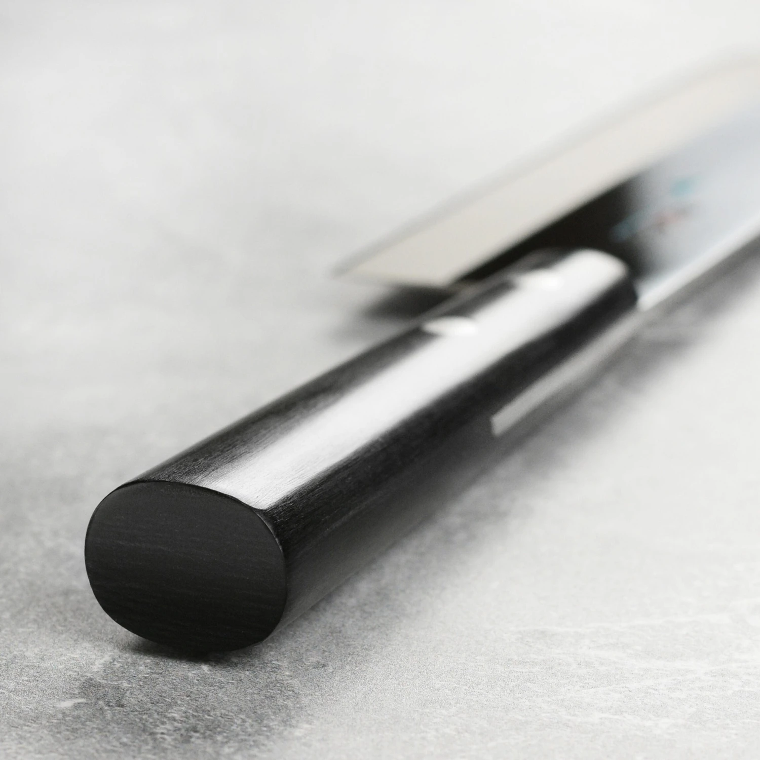 - Double bevel thin blade allows to slice effortlessly through almost anything