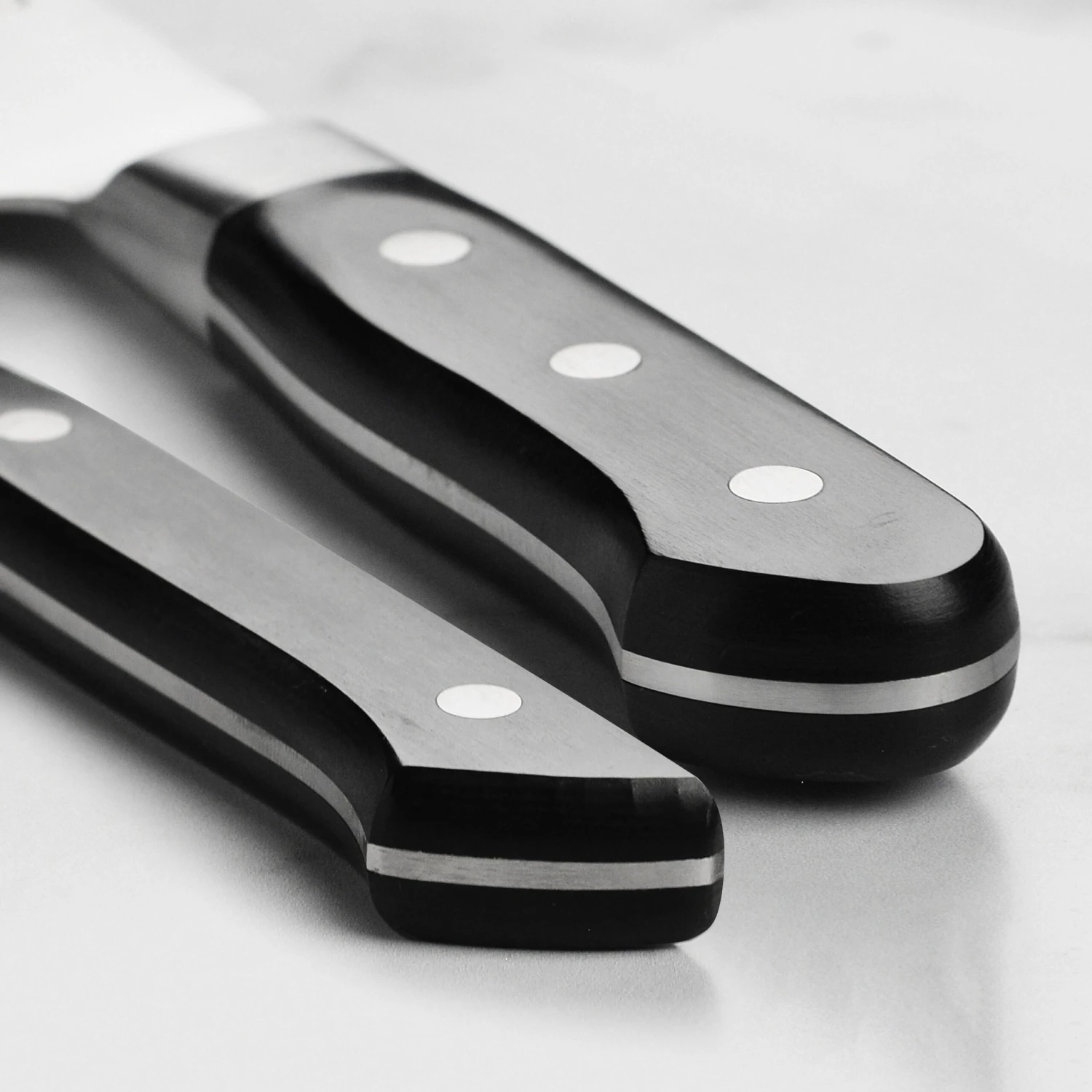 - Riveted handle constructed of resin Pakkawood with bolster for added weight and balance
