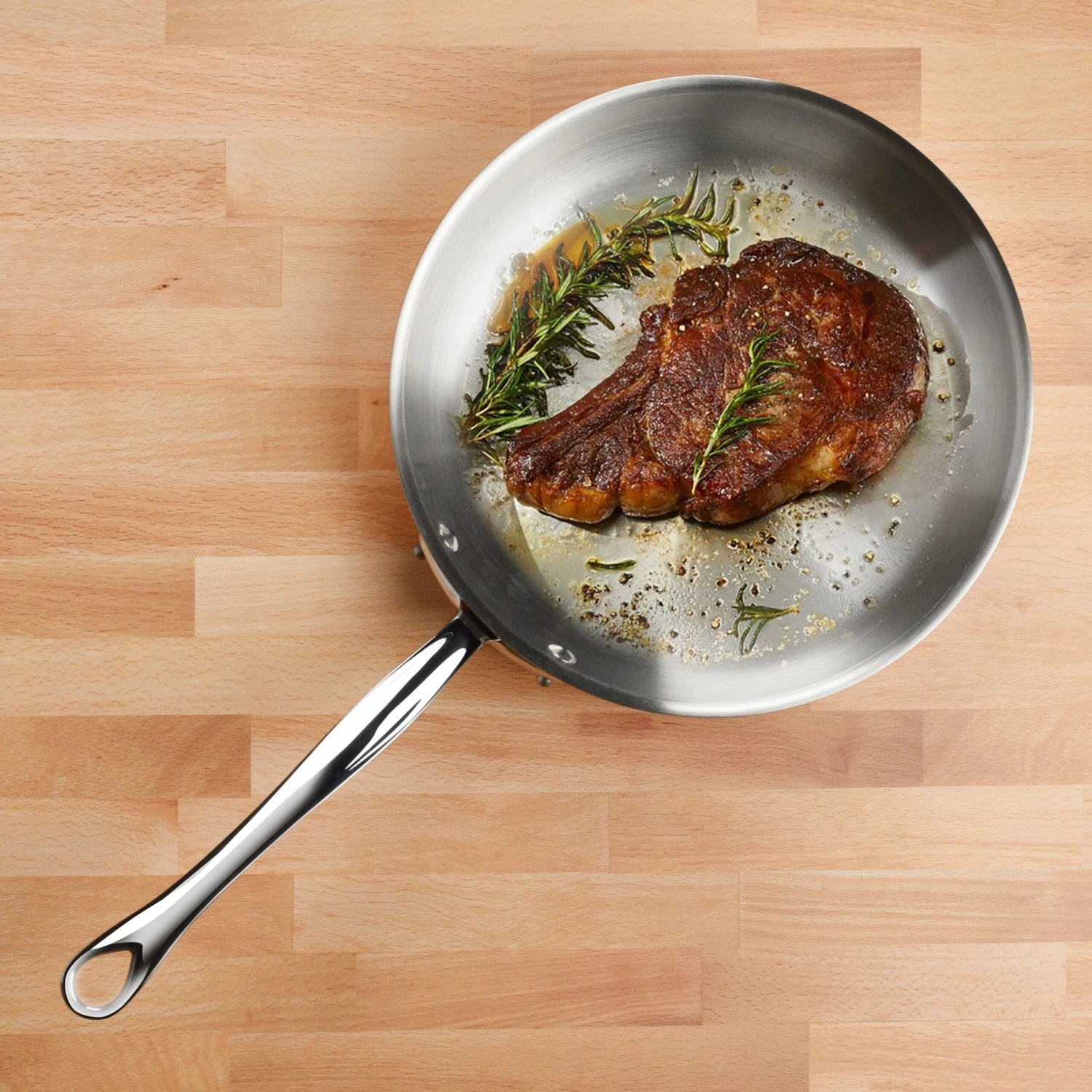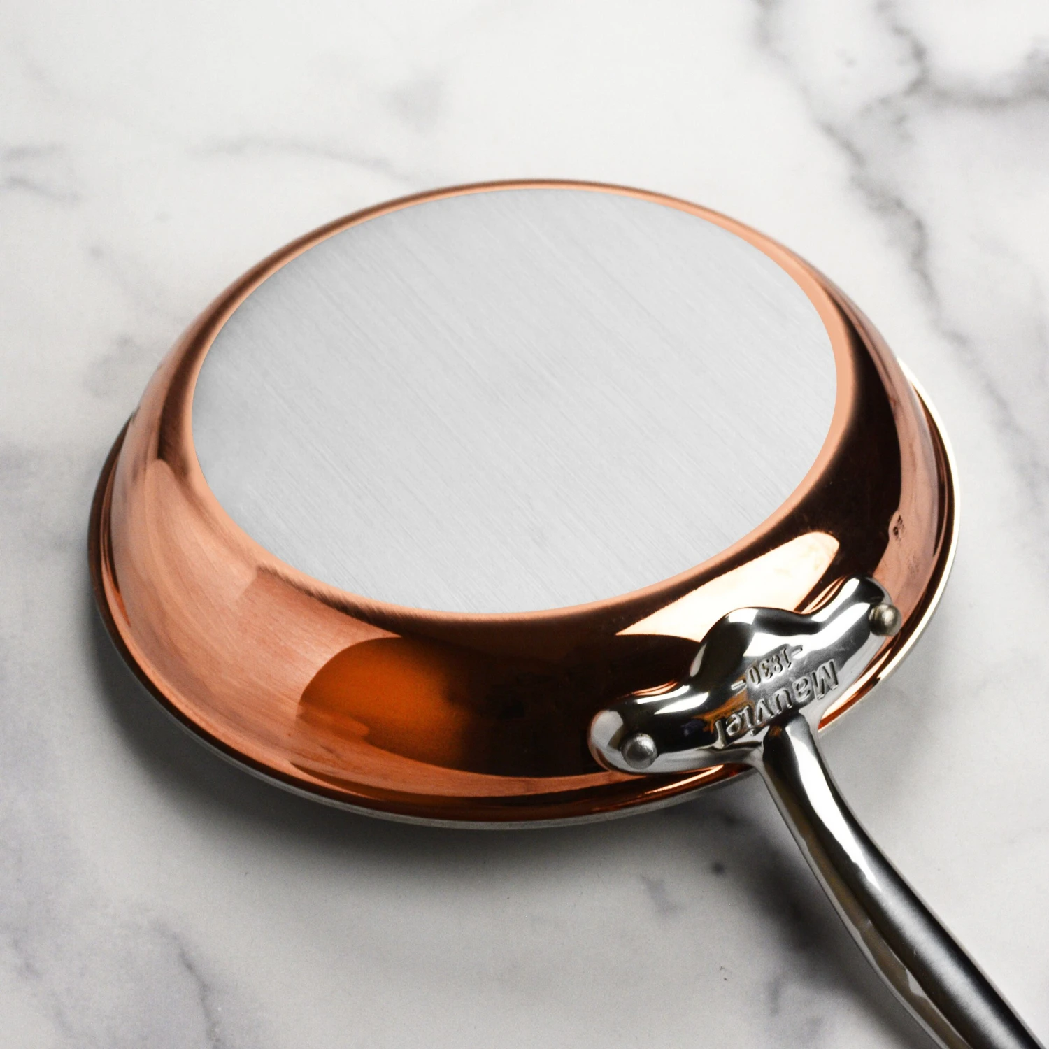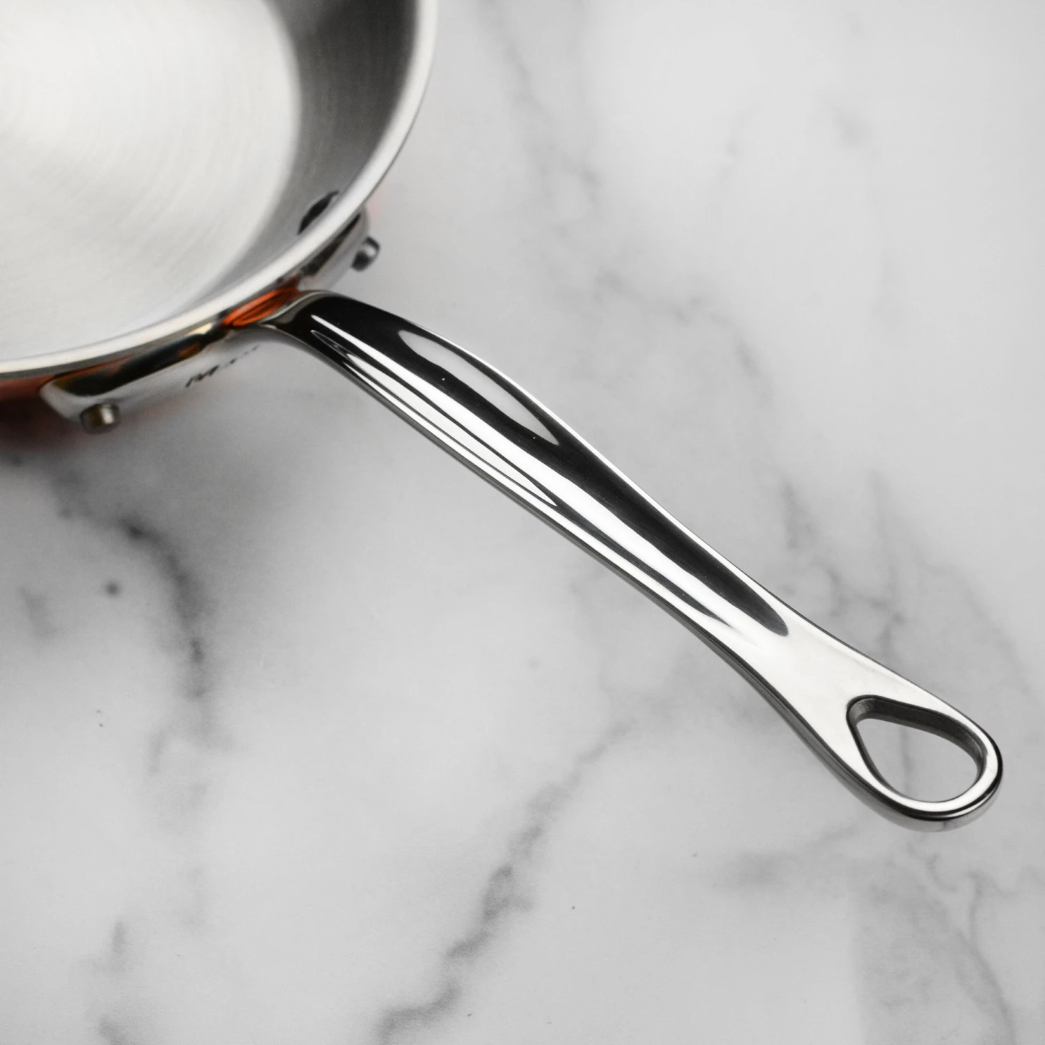 - Cast stainless steel handles fixed by sturdy stainless steel rivets; flared rims allow drip-free pouring