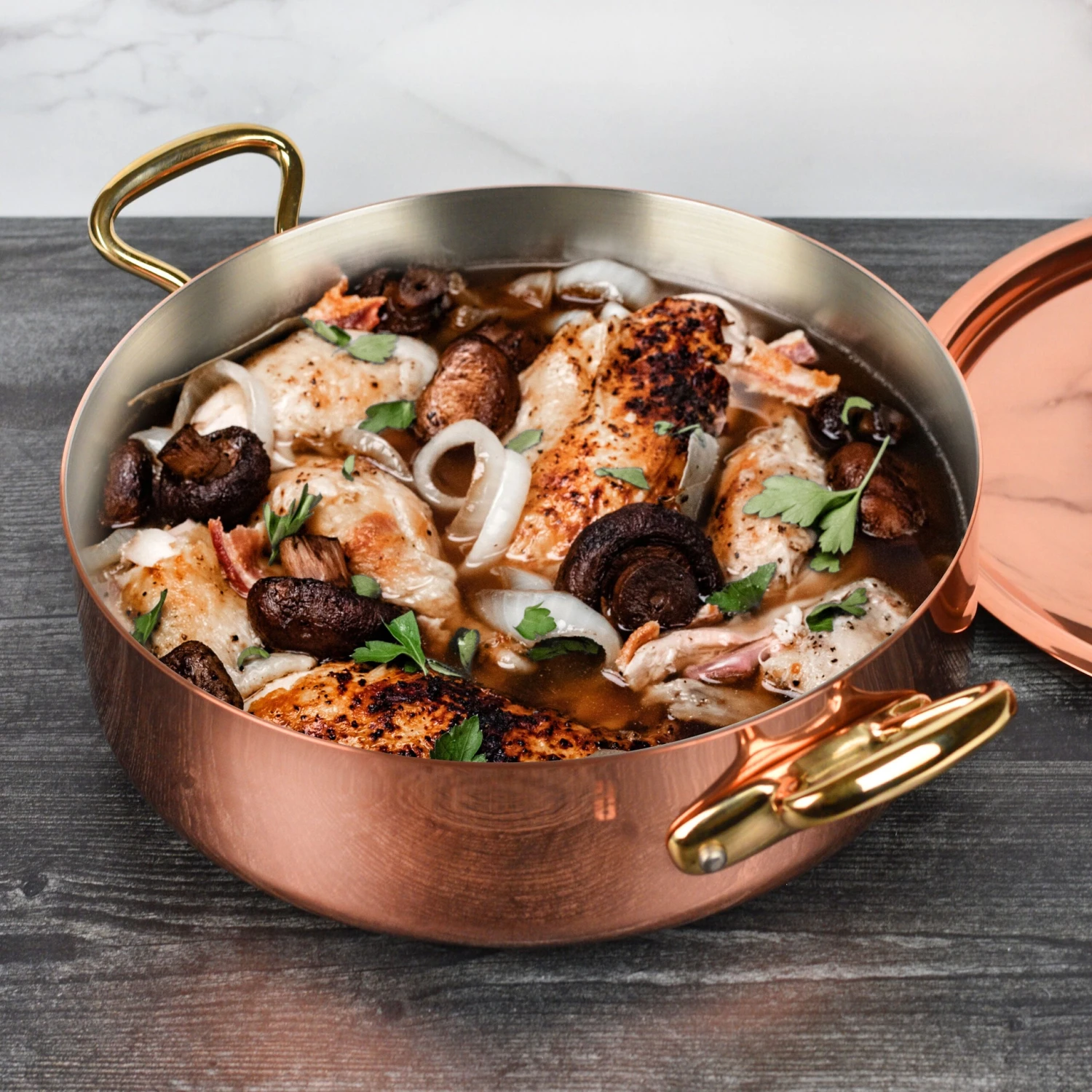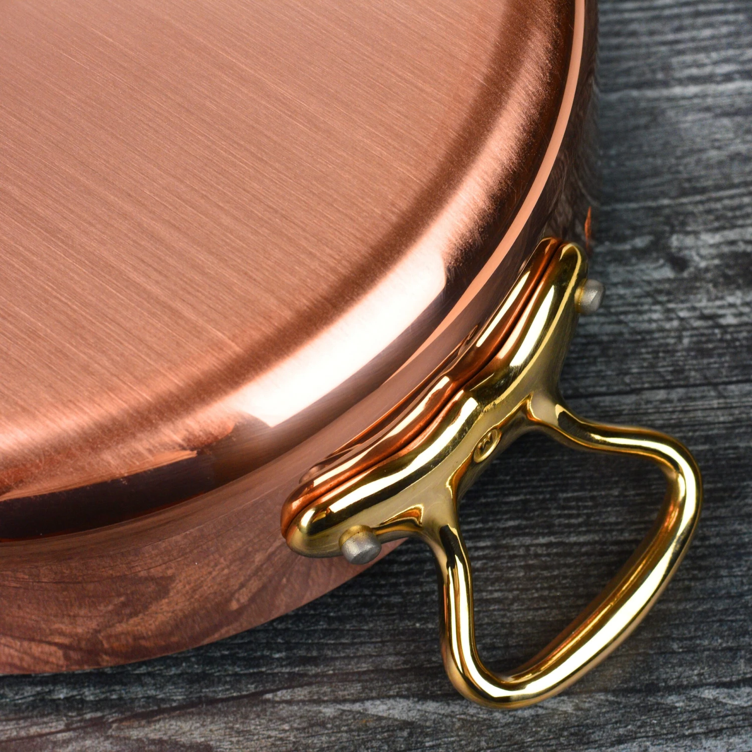 - Includes copper lid with bronze handle and stainless steel rivets