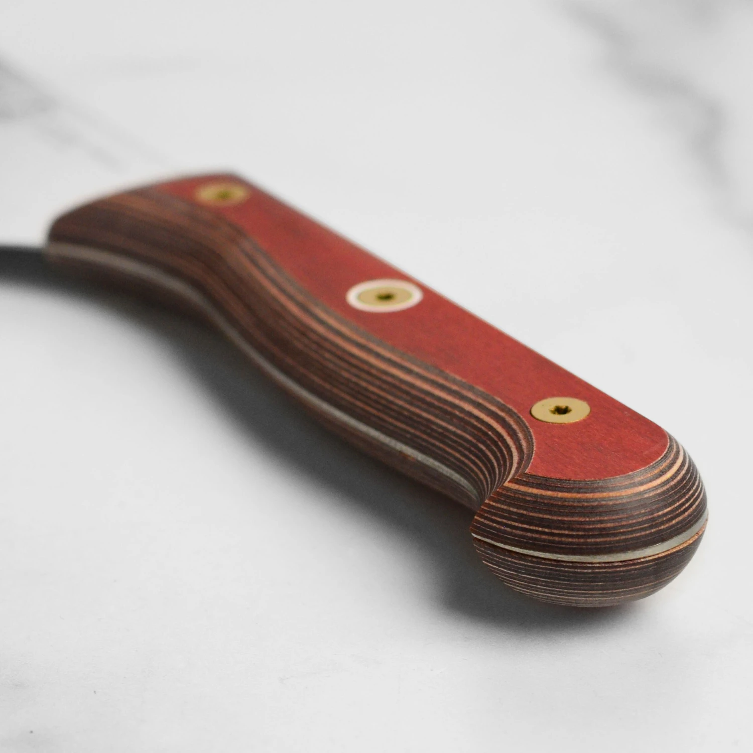 - Triple-rivet Pakkawood handle for improved grip ergonomics and cambered for optimal control