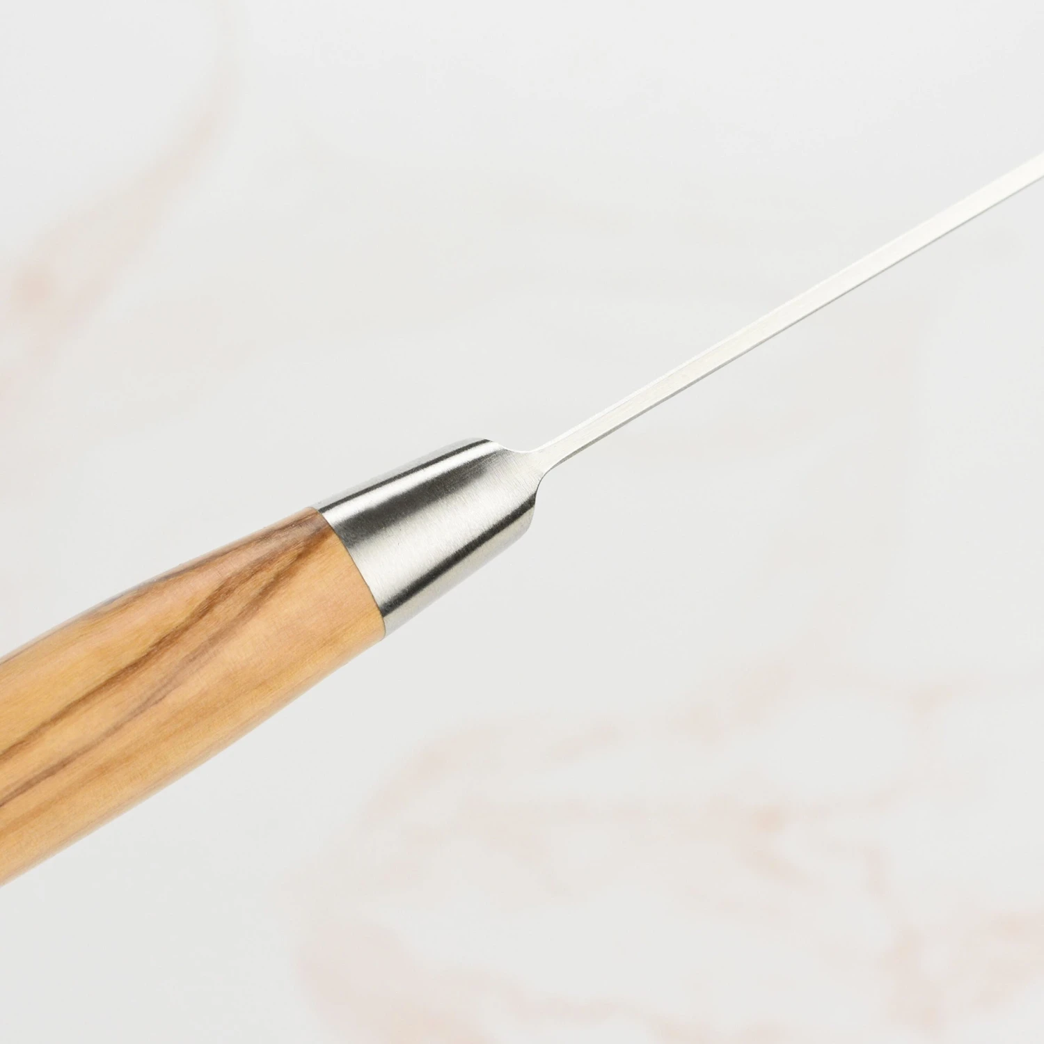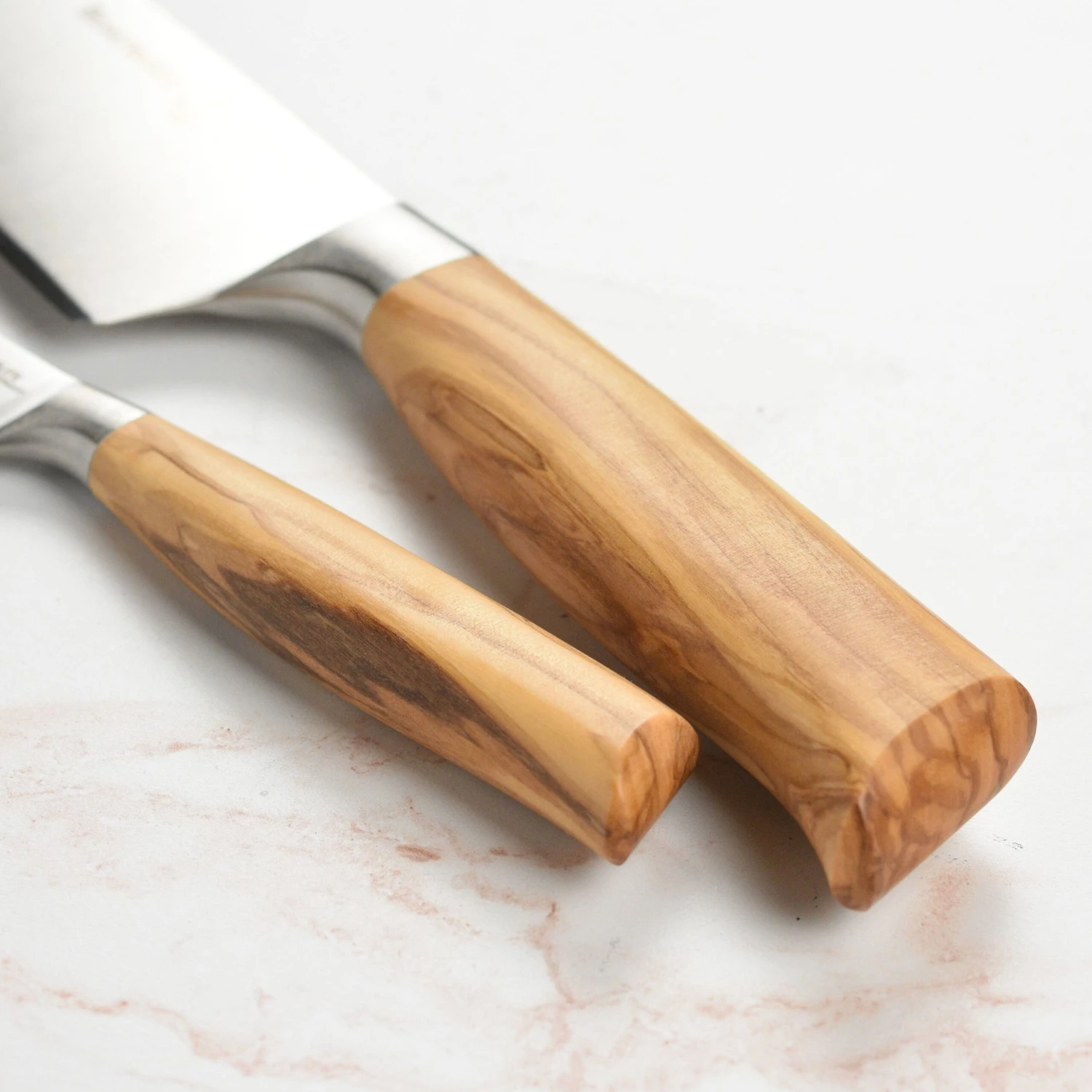 - Natural, Italian olive wood handle provides a secure ergonomic grip with an unsurpassed balance
