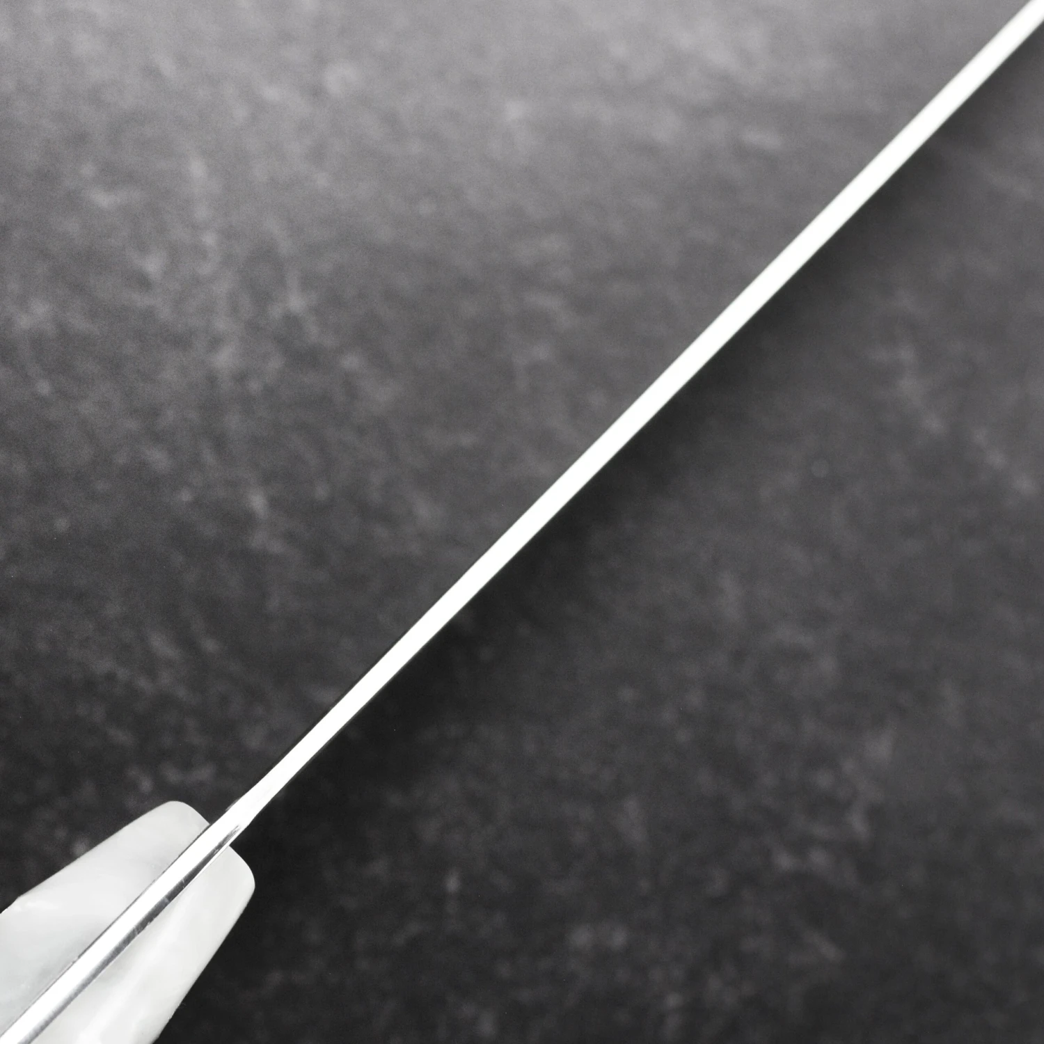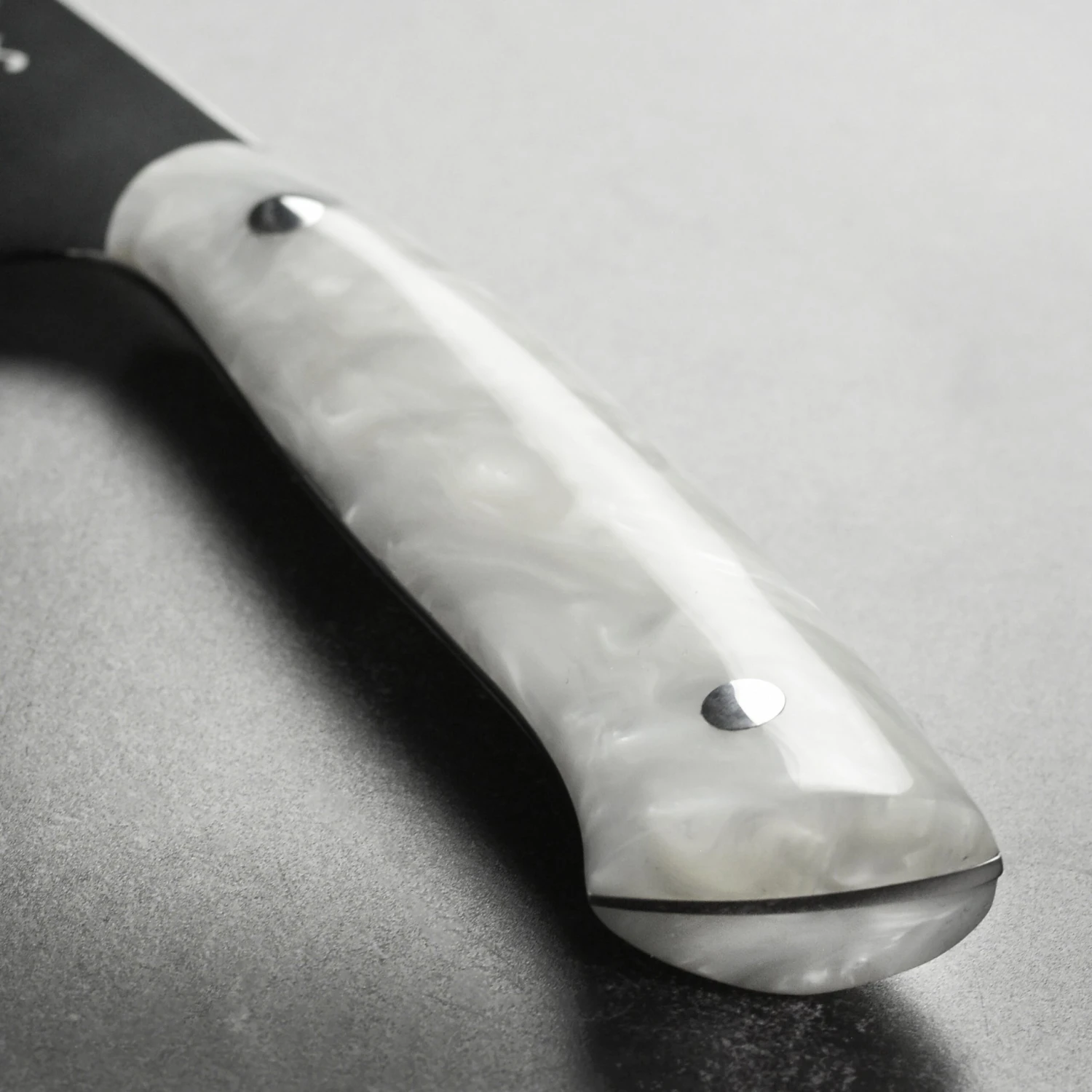 - Ergonomically designed signature Quintin Middleton handle with white pearl resin scales and stainless steel rivets; Smooth choil and spine for excellent comfort