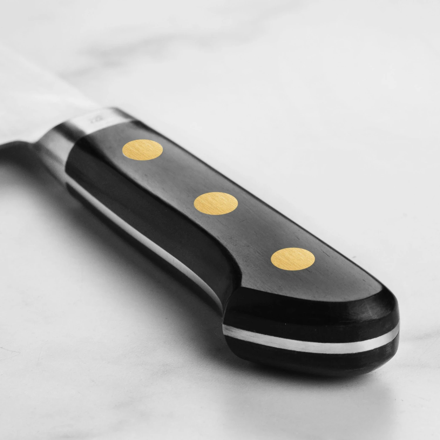 - Full-tang black Pakkawood handle with brass rivets and stainless steel bolster