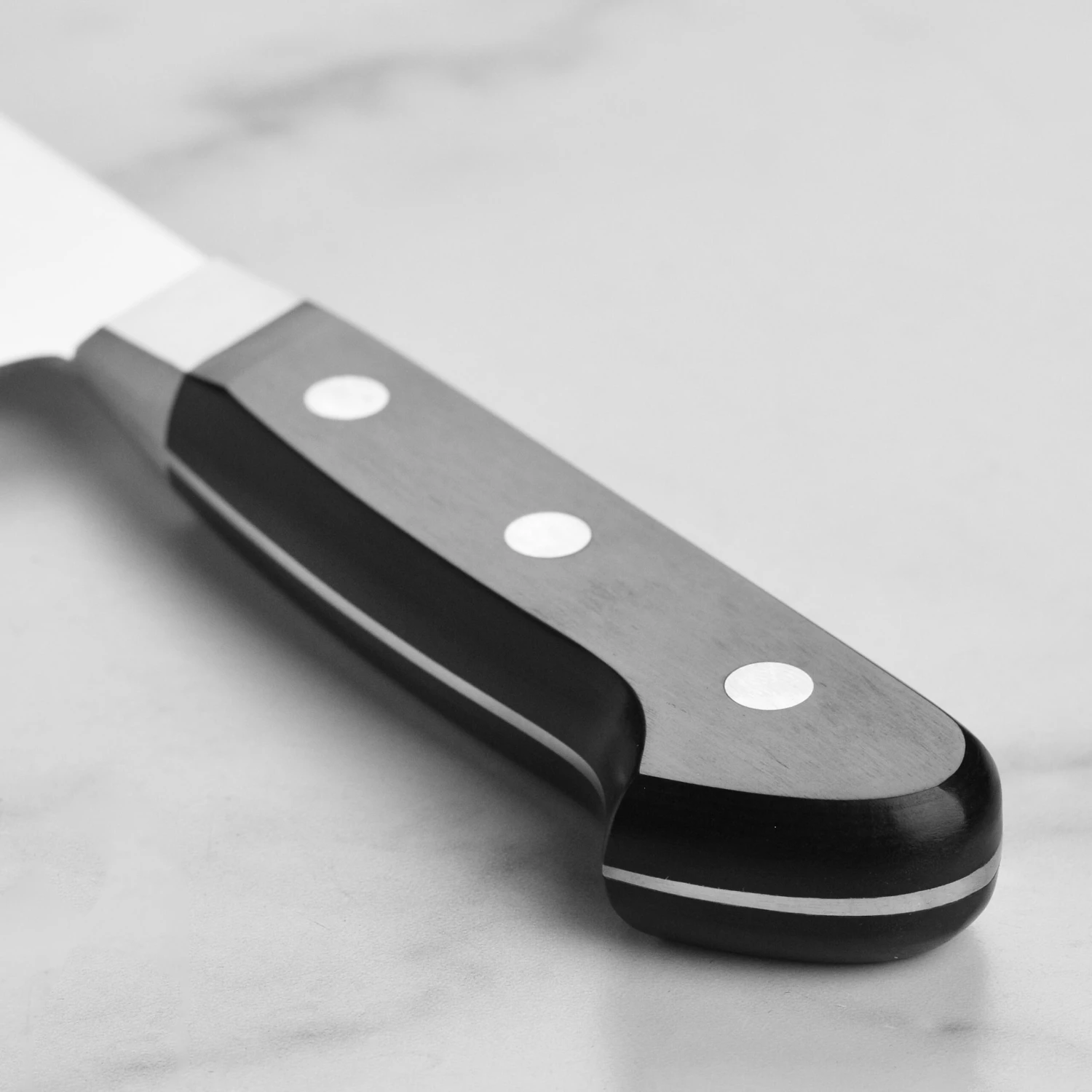- Laminated black wood handle with stainless rivets and nickel silver bolster