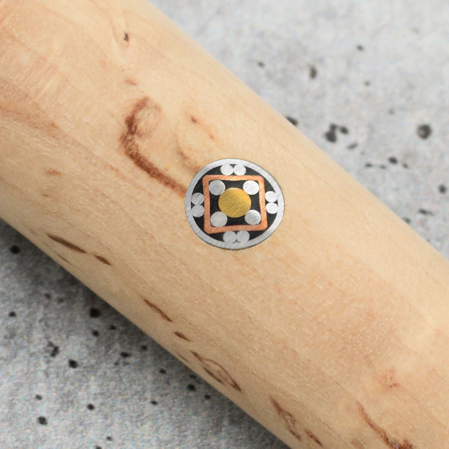 - Handle features a mosaic pin accent with two red spacers and stainless engraved end cap