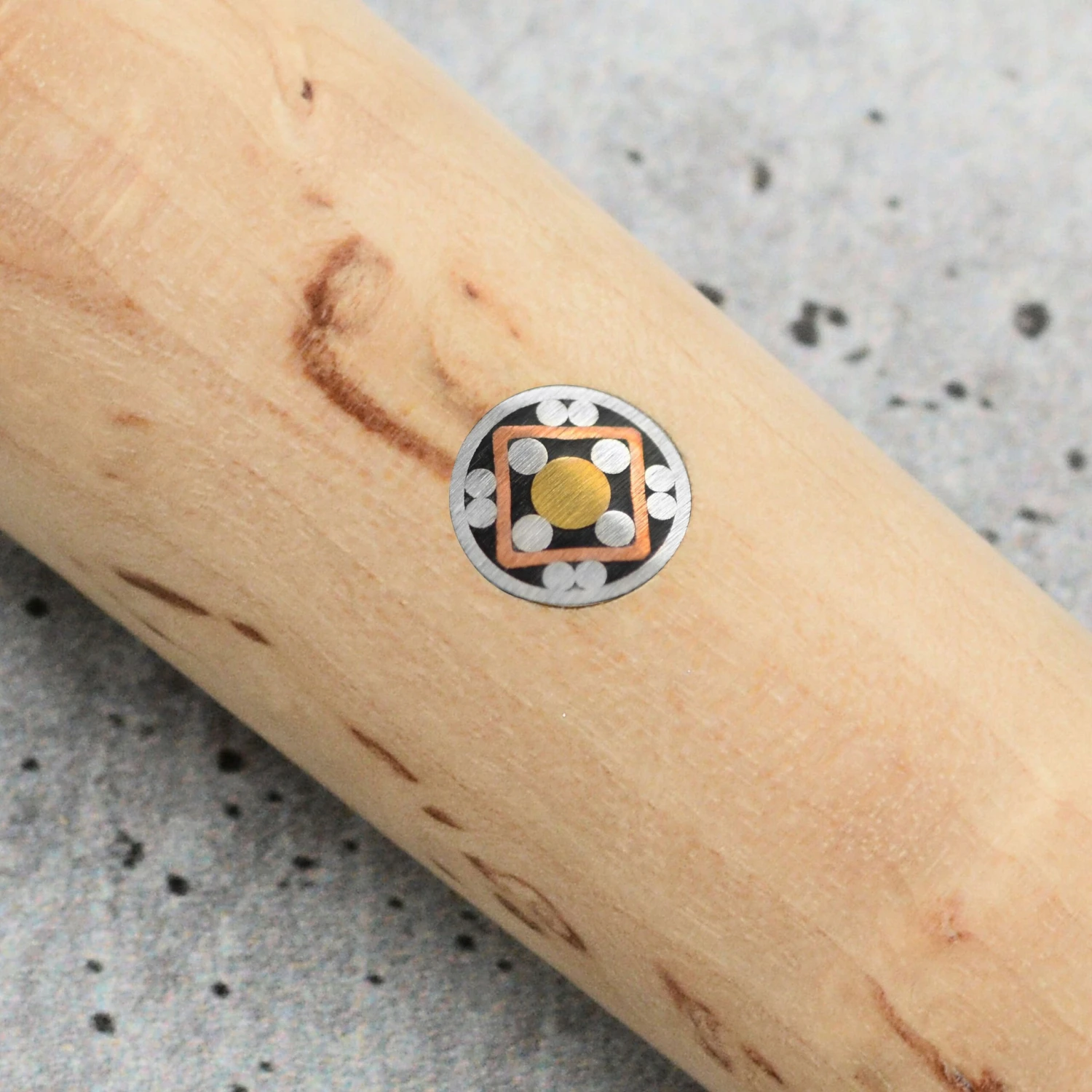 - Handles feature mosaic pin accent with two red spacers and stainless engraved end cap