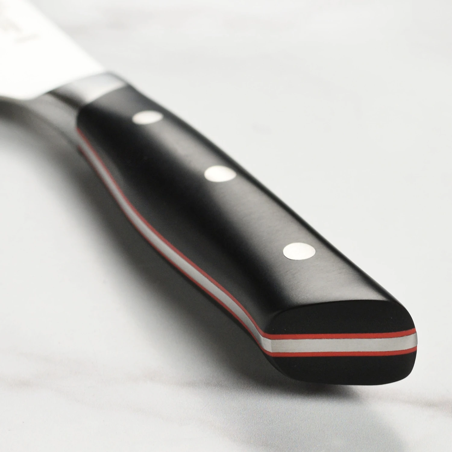 - Ergonomic, triple-riveted POM handle with red spacers nestles comfortably in the hand