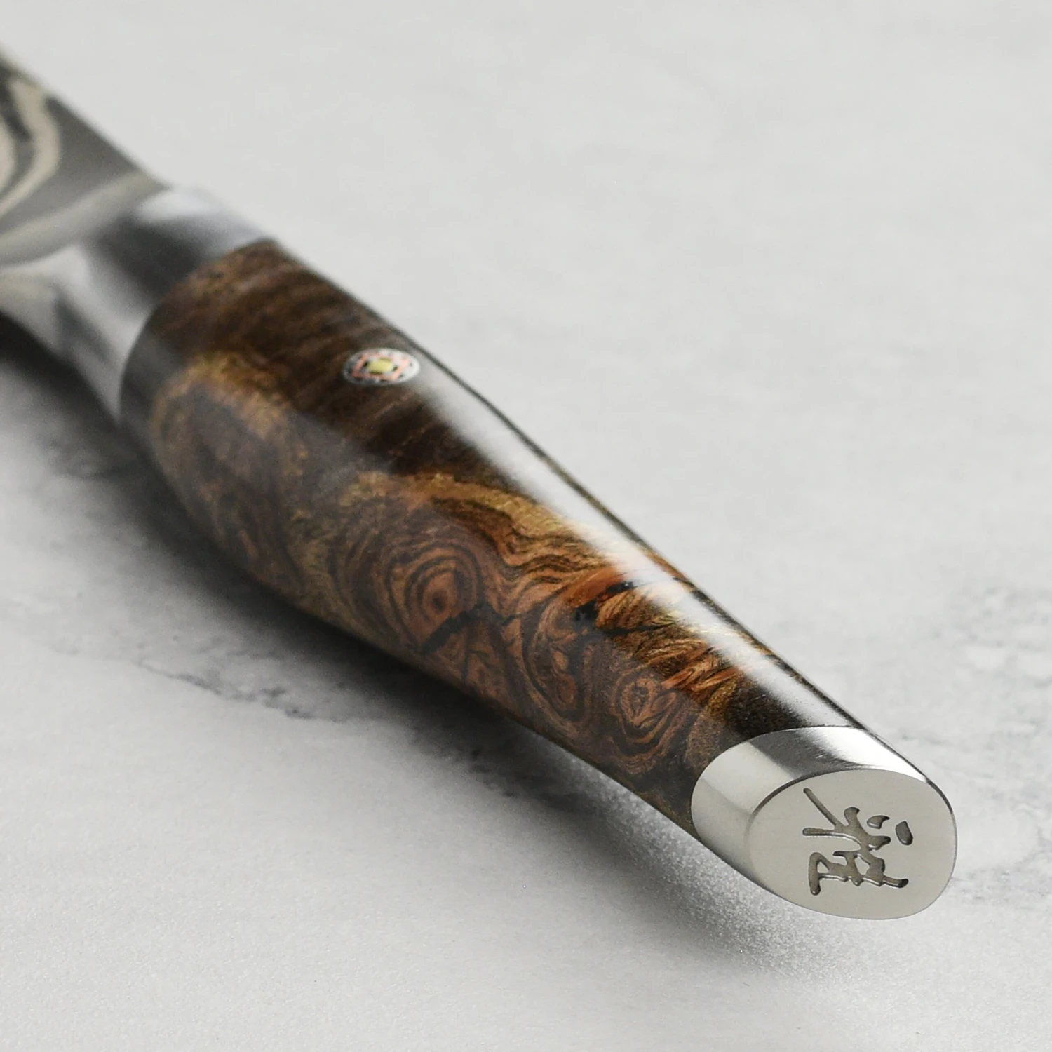 - Advanced high-carbon, 49-layer MC66 steel creates the “Moonlight” Damascus pattern; artfully carved Shinogi grind at the tip of the knife for an even sharper silhouette