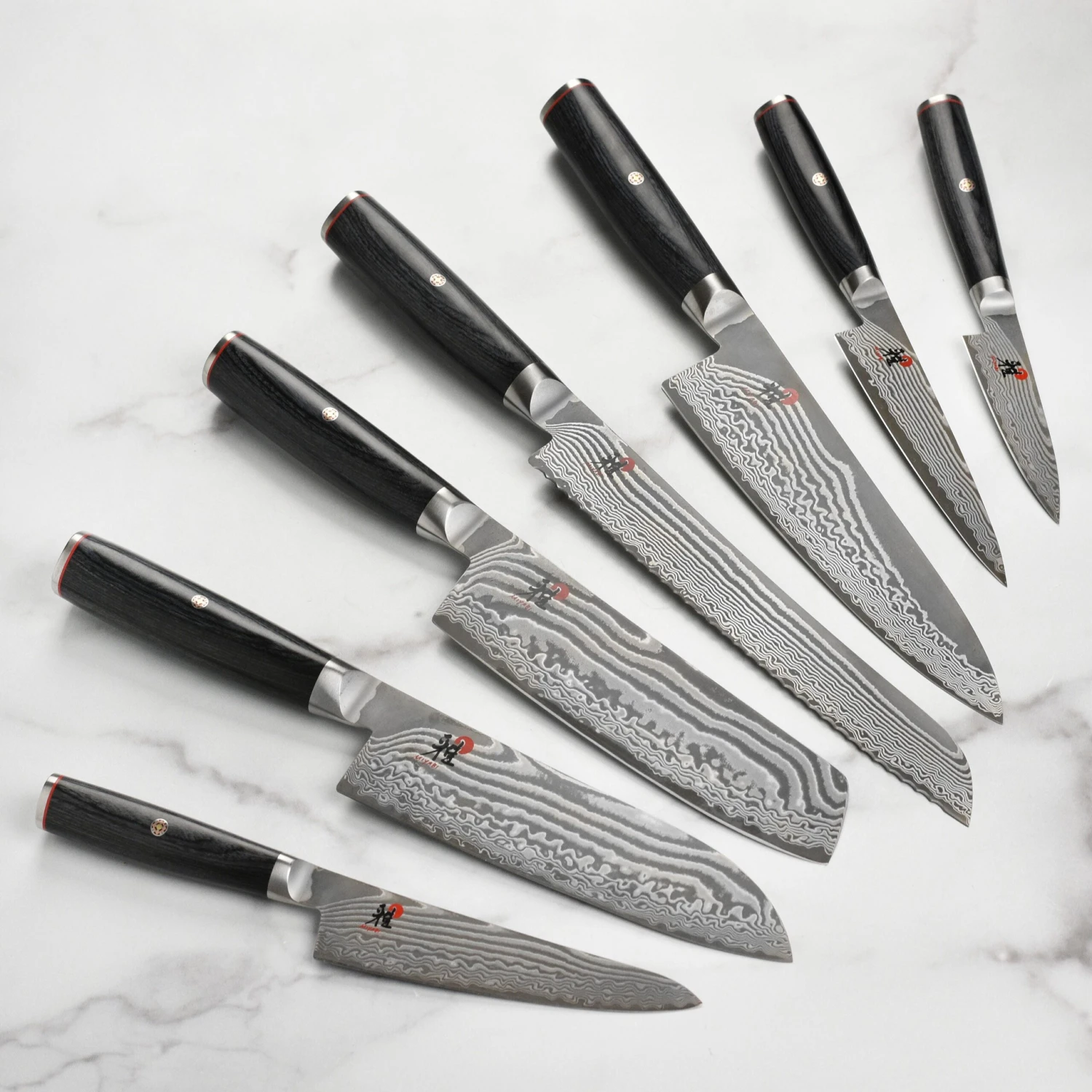- 61 Rockwell Hardness; traditional Japanese blade hand-honed to a 9 to 12° angle