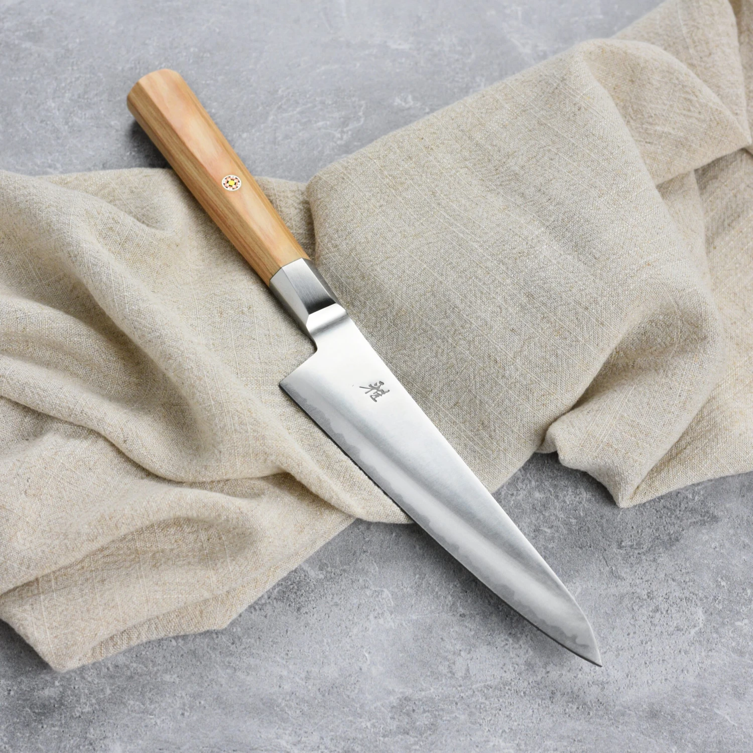 - Faceted birchwood pakkawood handle is individually weight adjusted with 9-step finishing process; mosaic accent