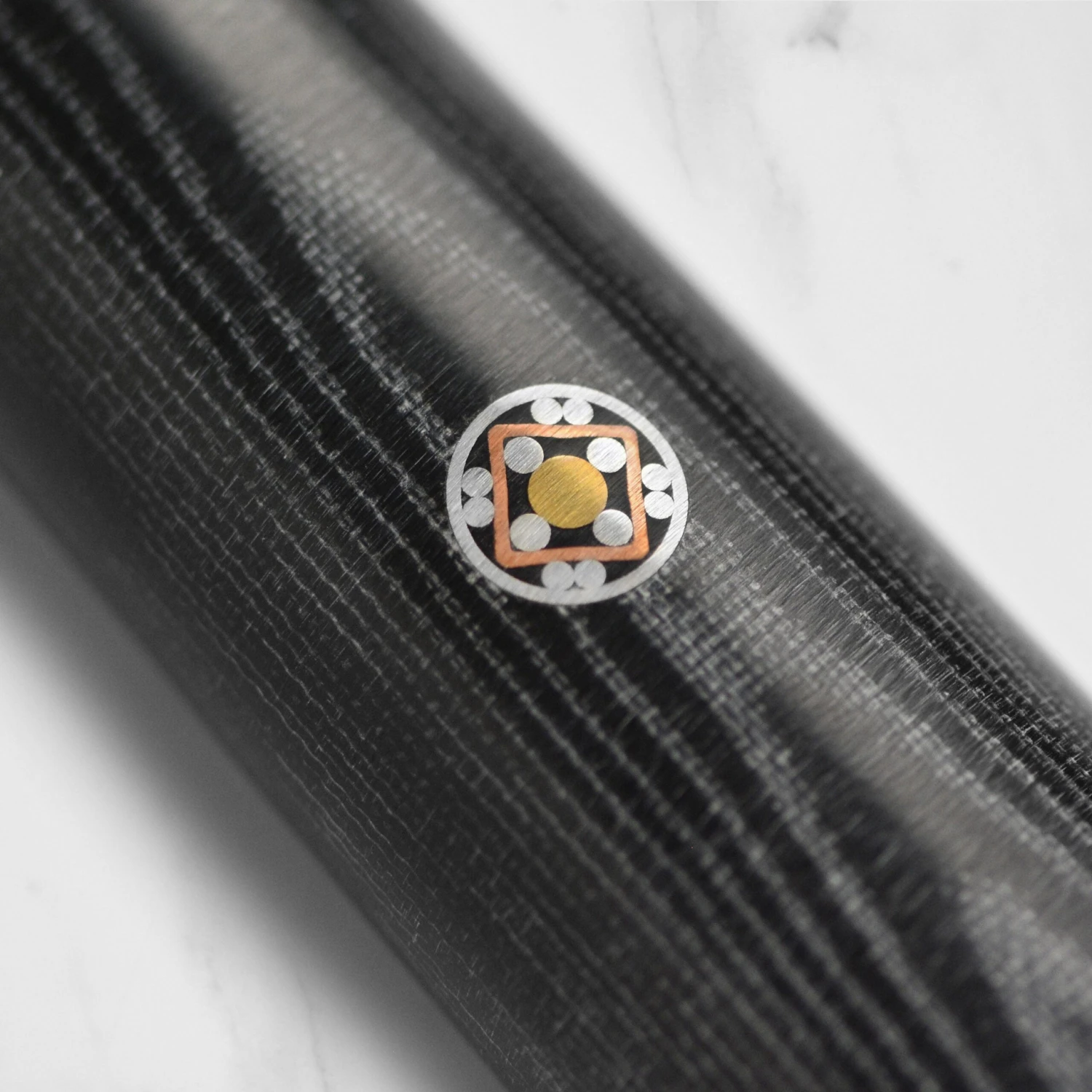 - Micarta D-shape handle, with a mosaic accent complimented by red spacers and a metal end cap with logo