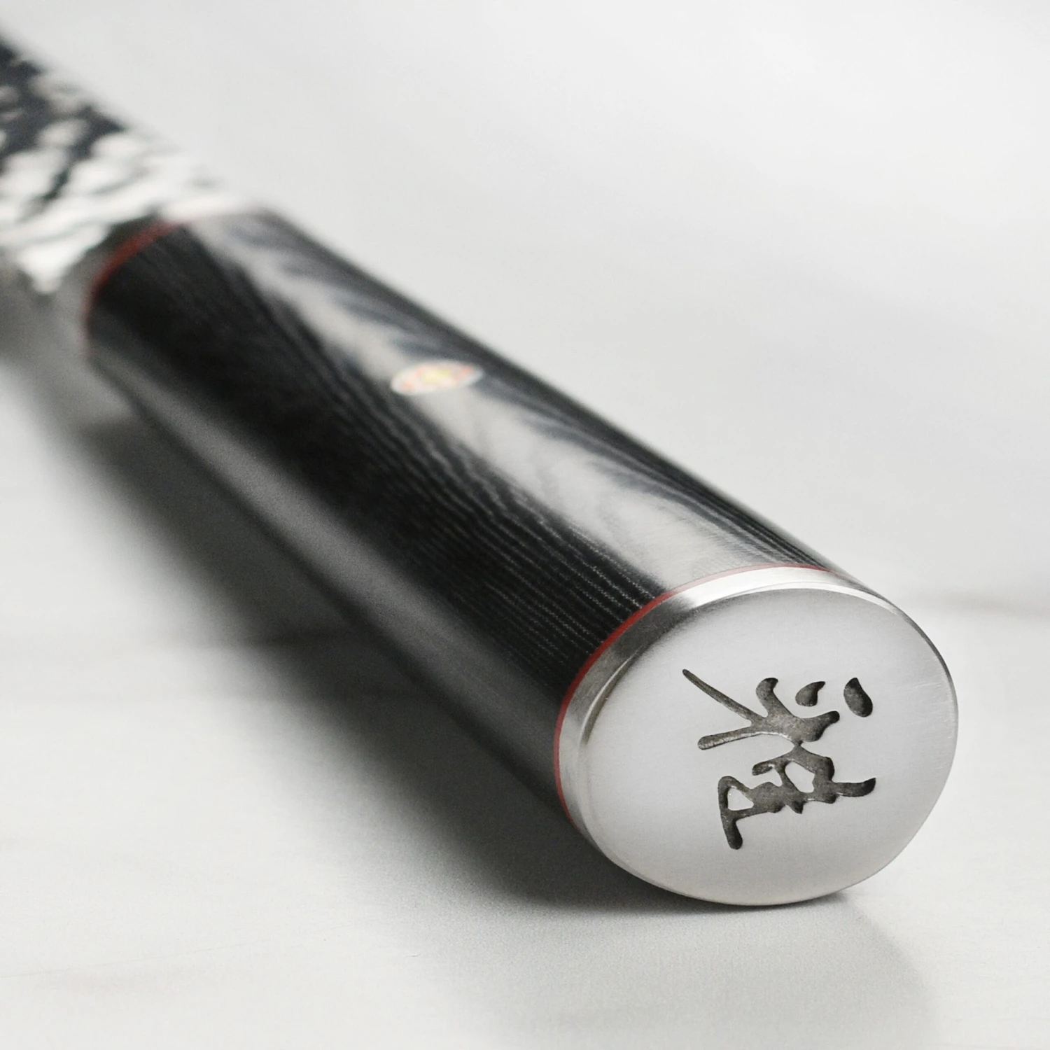 - Micarta D-shape handle, with a mosaic accent complimented by red spacers and a metal end cap with logo