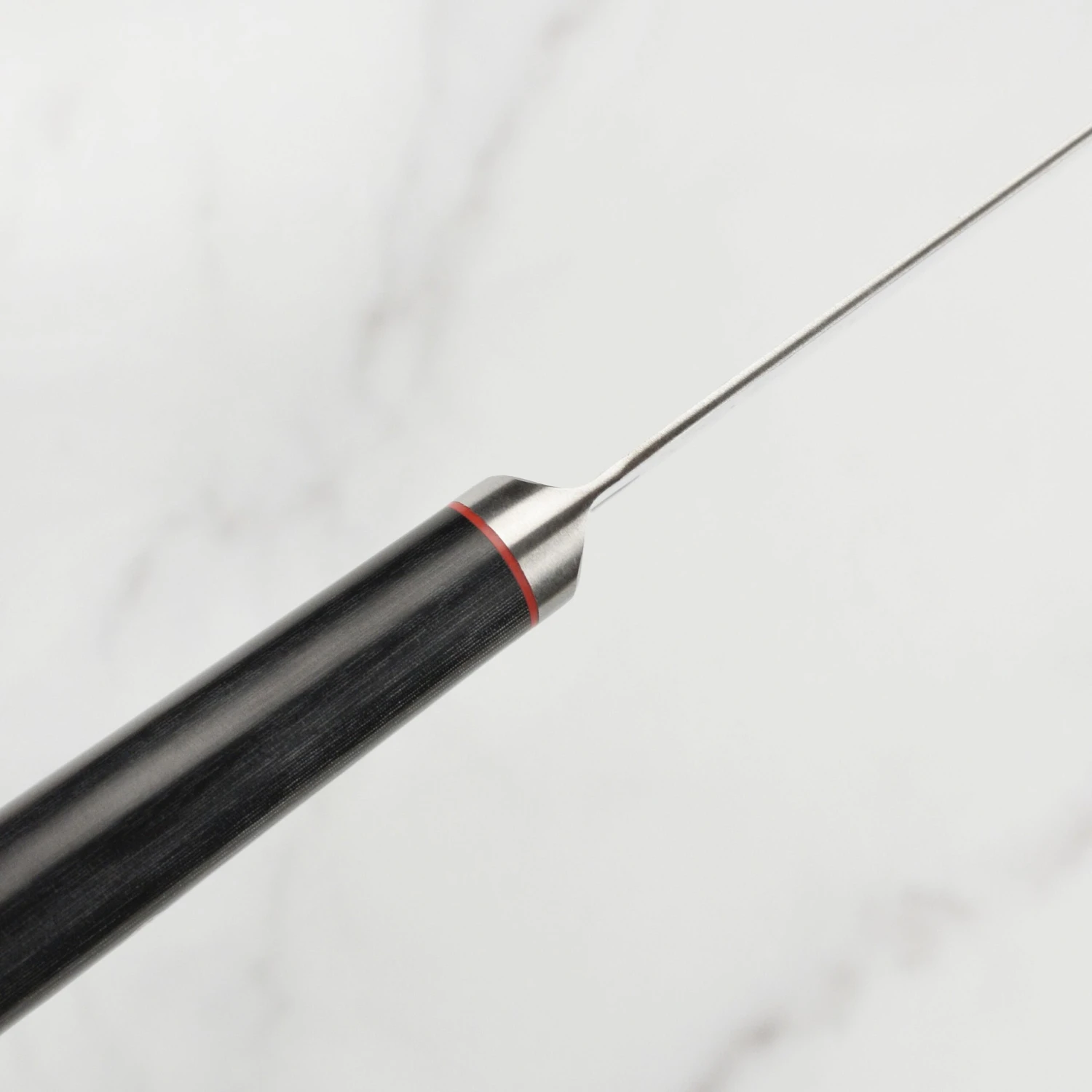 - Micarta D-shape handle, with a mosaic accent complimented by red spacers and a metal end cap with logo