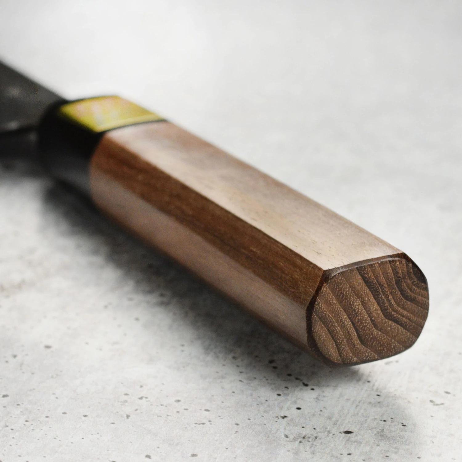 - Hand-forged Aogami Super blue steel blade; 64 Rockwell Hardness