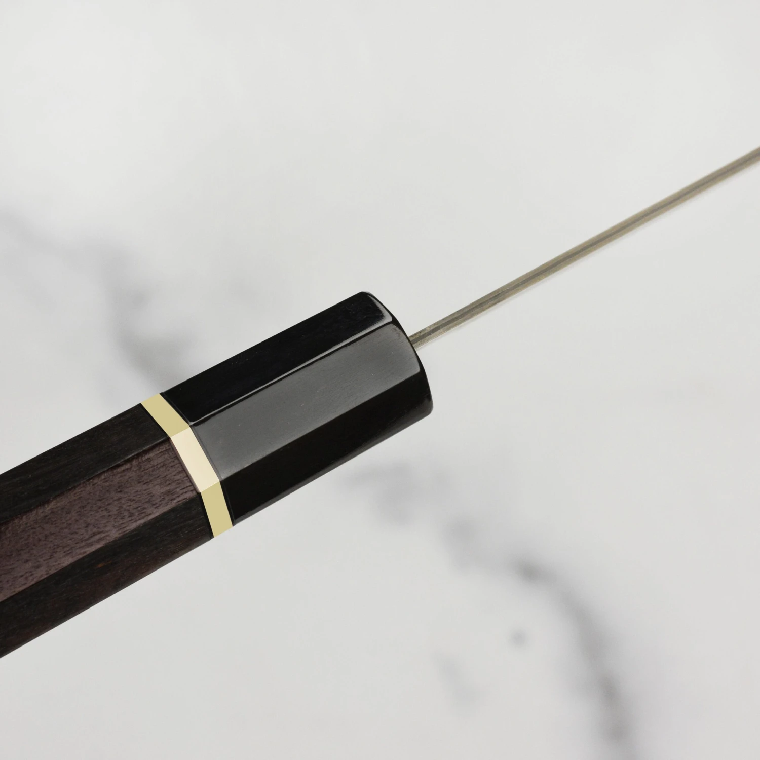 - Macassar ebony octagonal handle with buffalo horn ferrule and aluminum ring