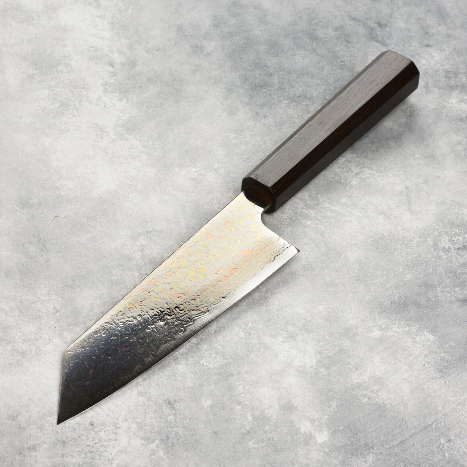 - Saji-san’s signature “Rainbow” Colored Damascus steel is highly polished to a mirror finish enhancing the bright gold colors of the copper and brass cladding
