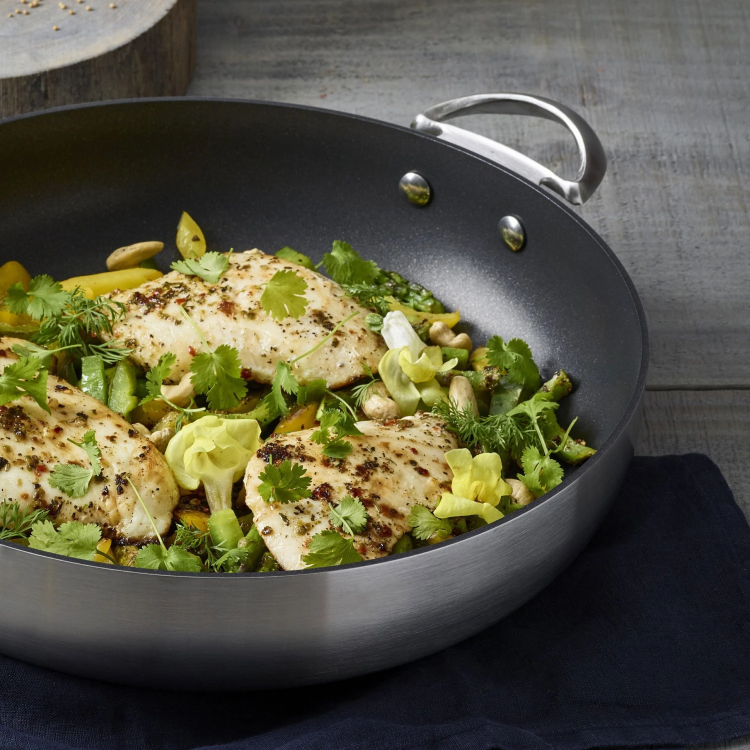 - Cast stainless steel handles stay cool longer; for use with silicone, wood, nylon and metal utensils