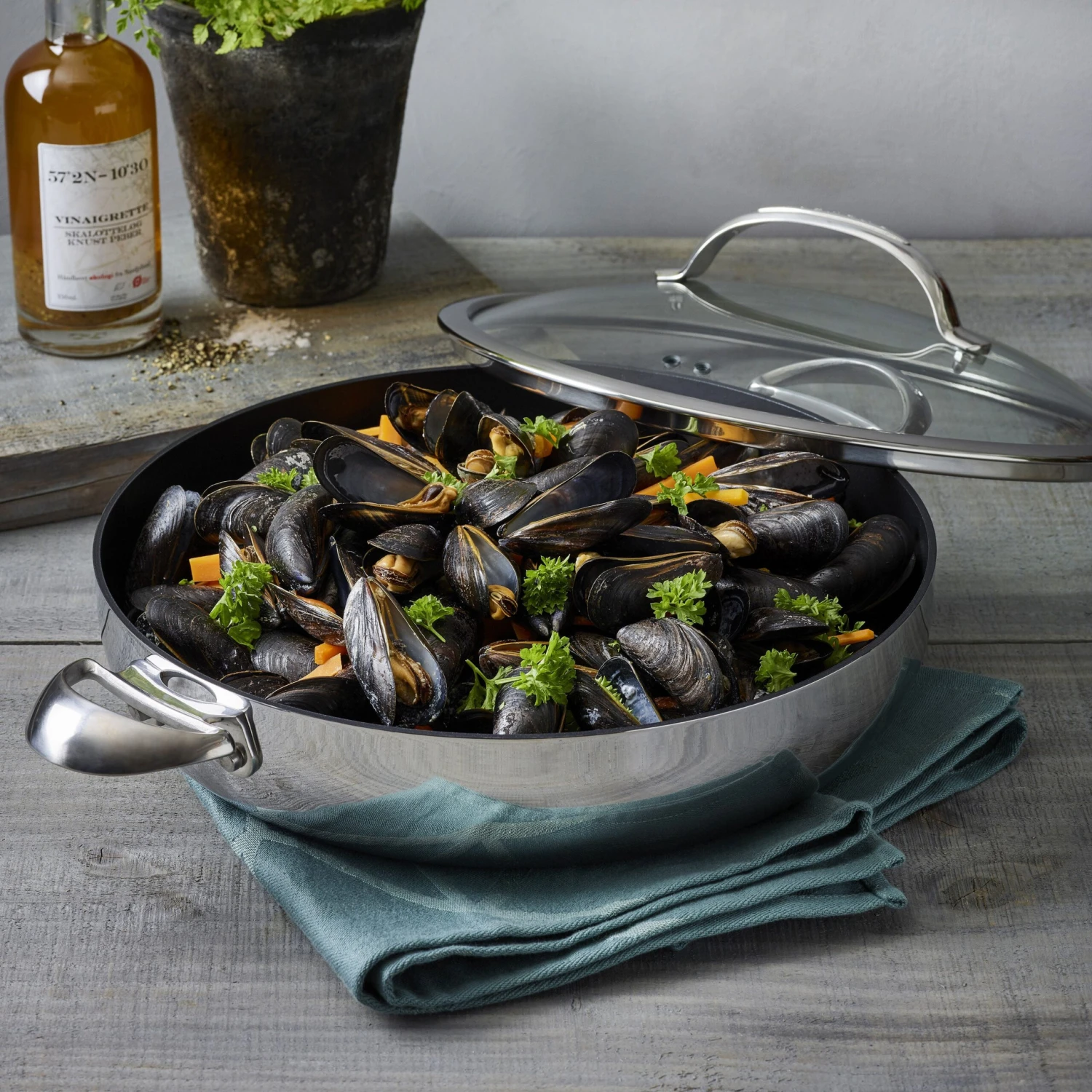 - Cast stainless steel riveted handle stays cool longer; for use with silicone, wood, nylon and metal utensils; includes glass lid