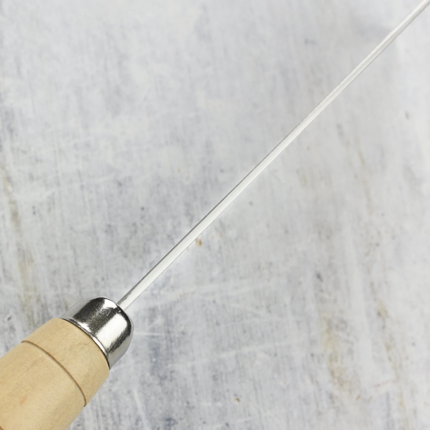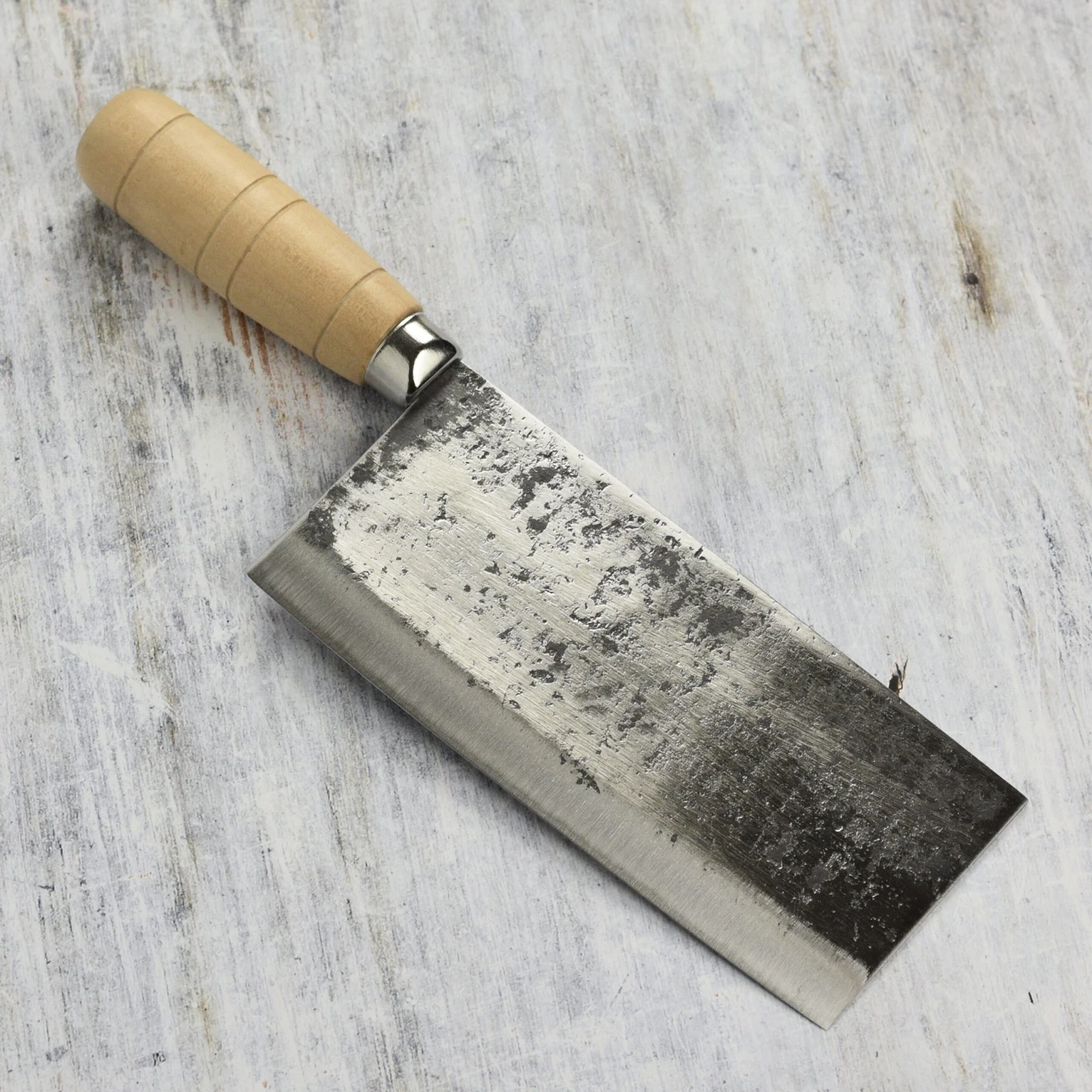 This rustic Chinese cleaver is hand-forged using Japanese shirogami #2 carbon steel that is clad with stainless steel for easier overall maintenance. It is made in China and features a semi-polished (“migaki”) finish and a polished edge with a traditional barrel-style maple handle and stainless steel ferrule. The core steel is hardened to around 60 HRC to maintain its toughness, but this knife is definitely ground thin so it is a great slicer and not designed to chop through any hard bones or frozen foods. Must keep blade clean and dry to prevent rust from forming on the carbon steel edge. Wash by hand only.