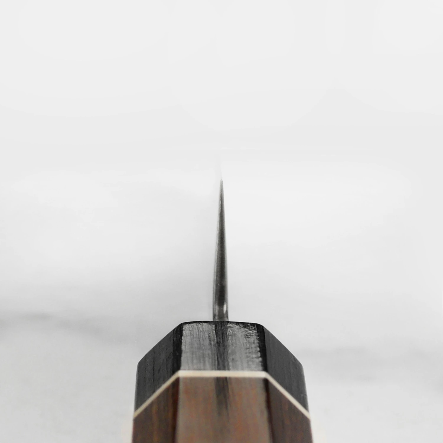 - Brown and black Pakkawood octagon handle with white fiber ring