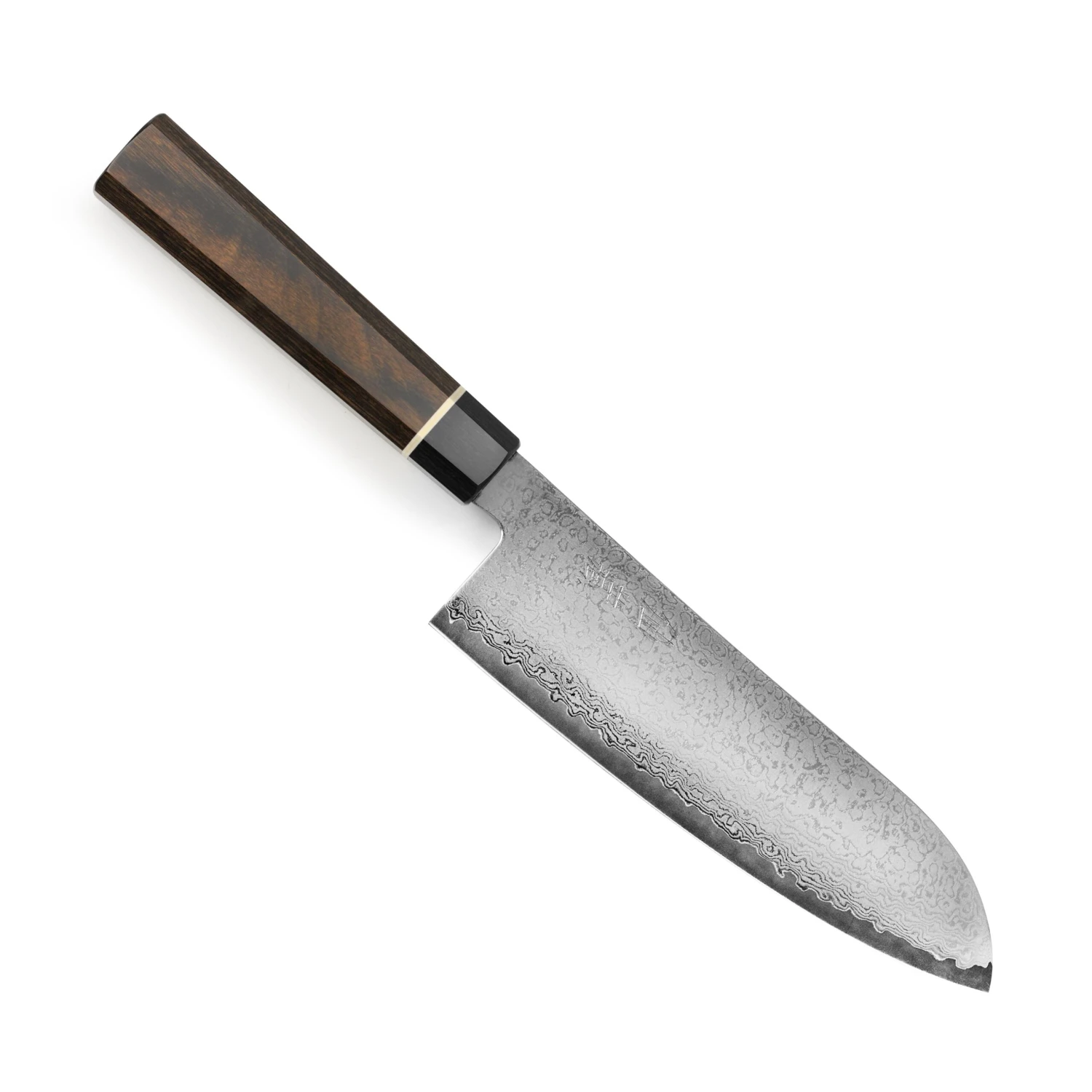 - Brown and black Pakkawood octagon handle with white fiber ring