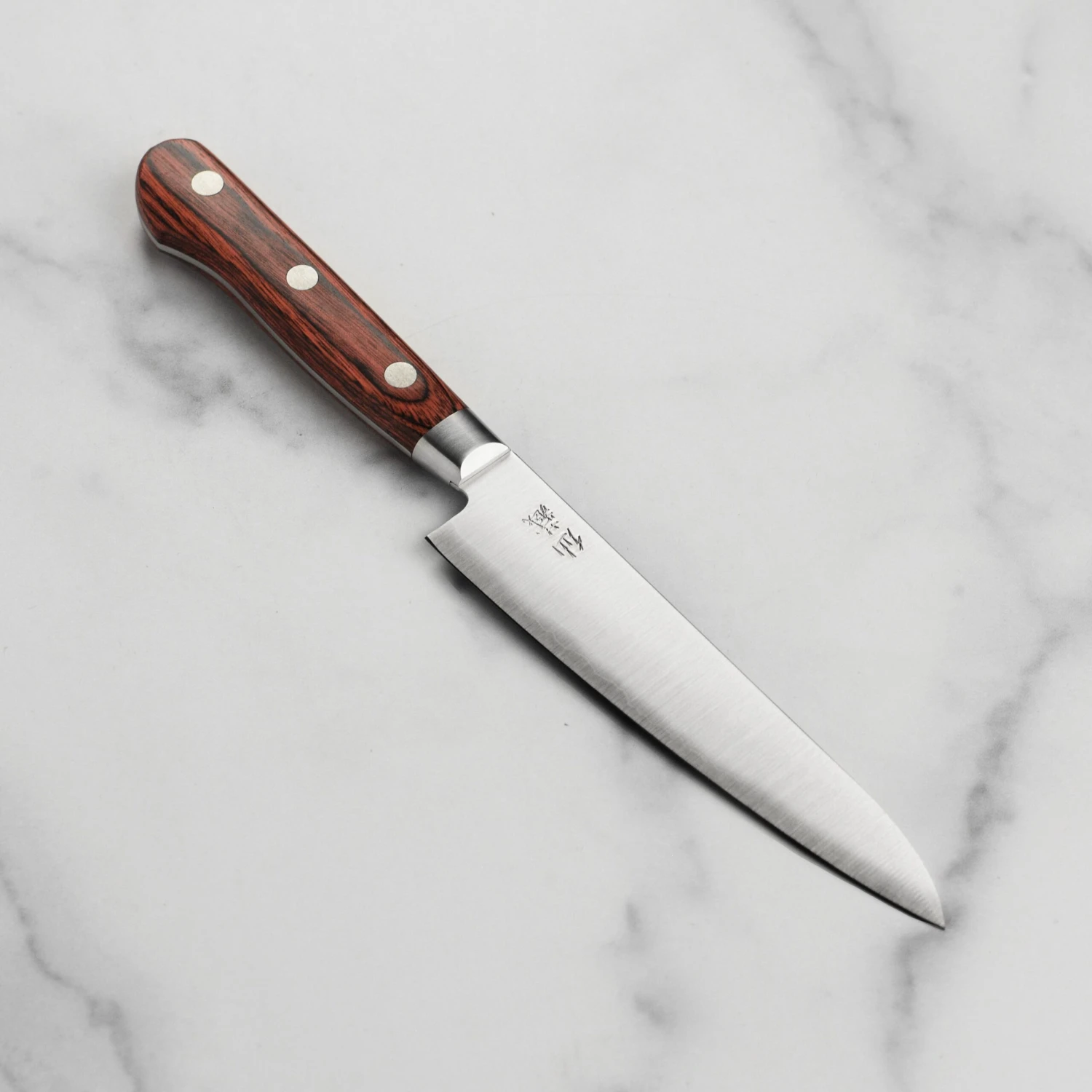- Brown Pakkawood handle with stainless steel rivets and bolster