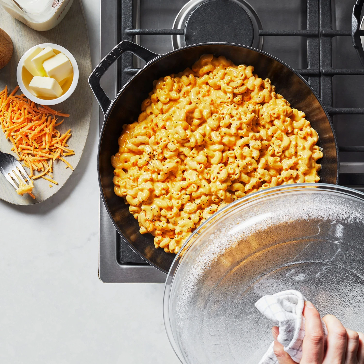 - Tight-fitting glass lid with nickel-plated knob retains moisture