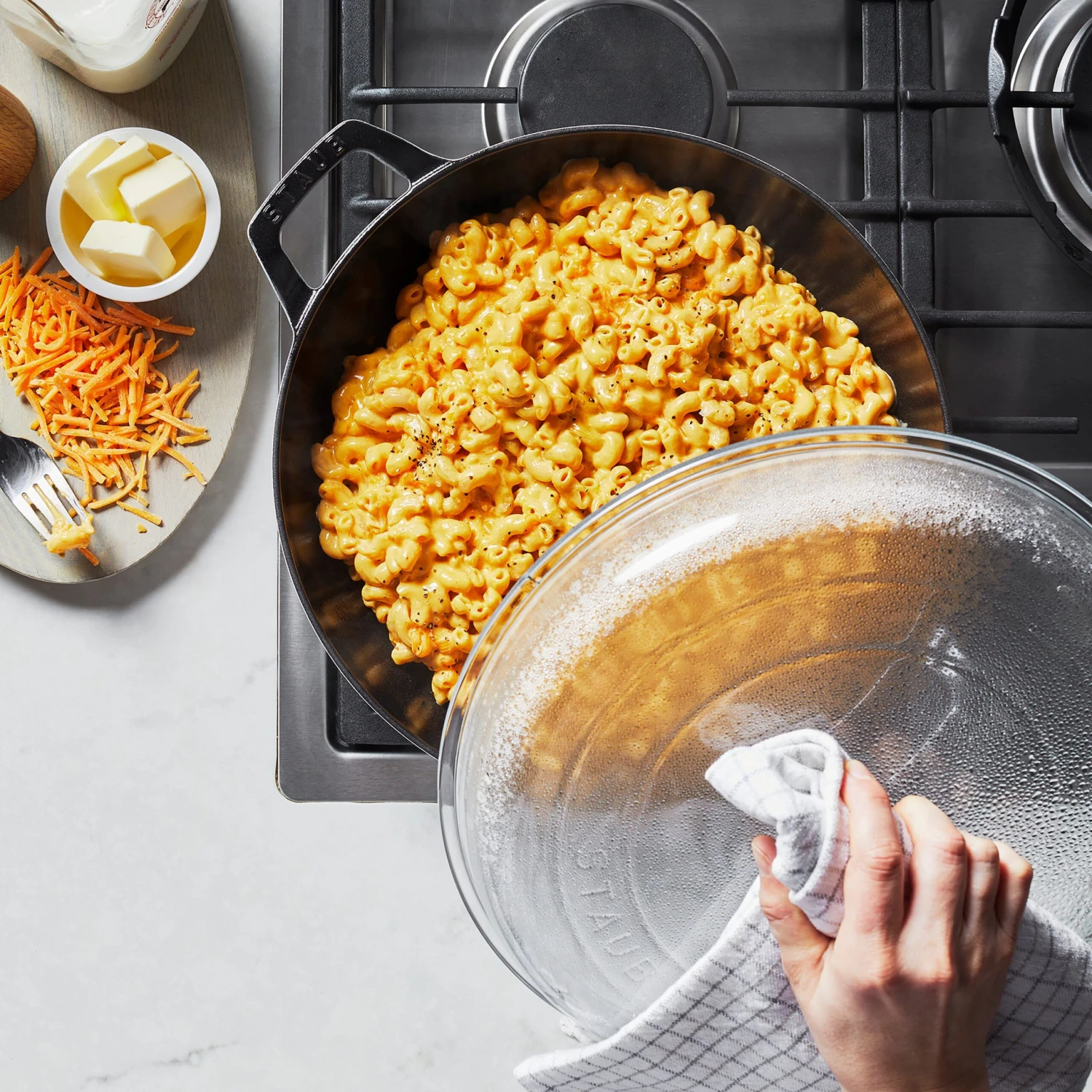 - Tight-fitting glass lid with nickel-plated knob retains moisture