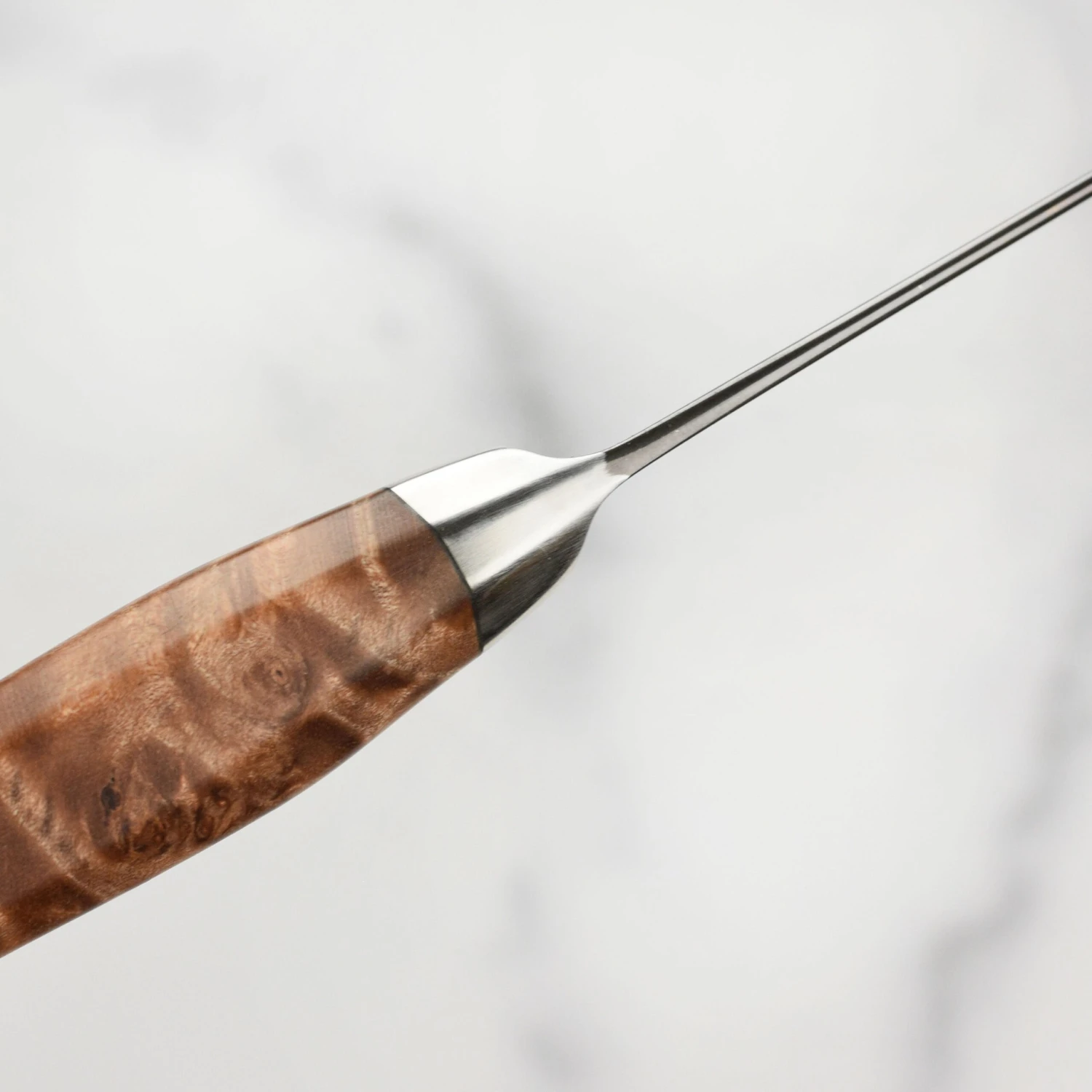 - Half-octagonal top handle shaped with a smooth rounded base, constructed of natural wood, locally sourced Oregon Big Leaf Maple Burl; stabilized with resin to meet tough kitchen requirements and prevent shrinking or swelling; integral end cap with engraved Steelport logo