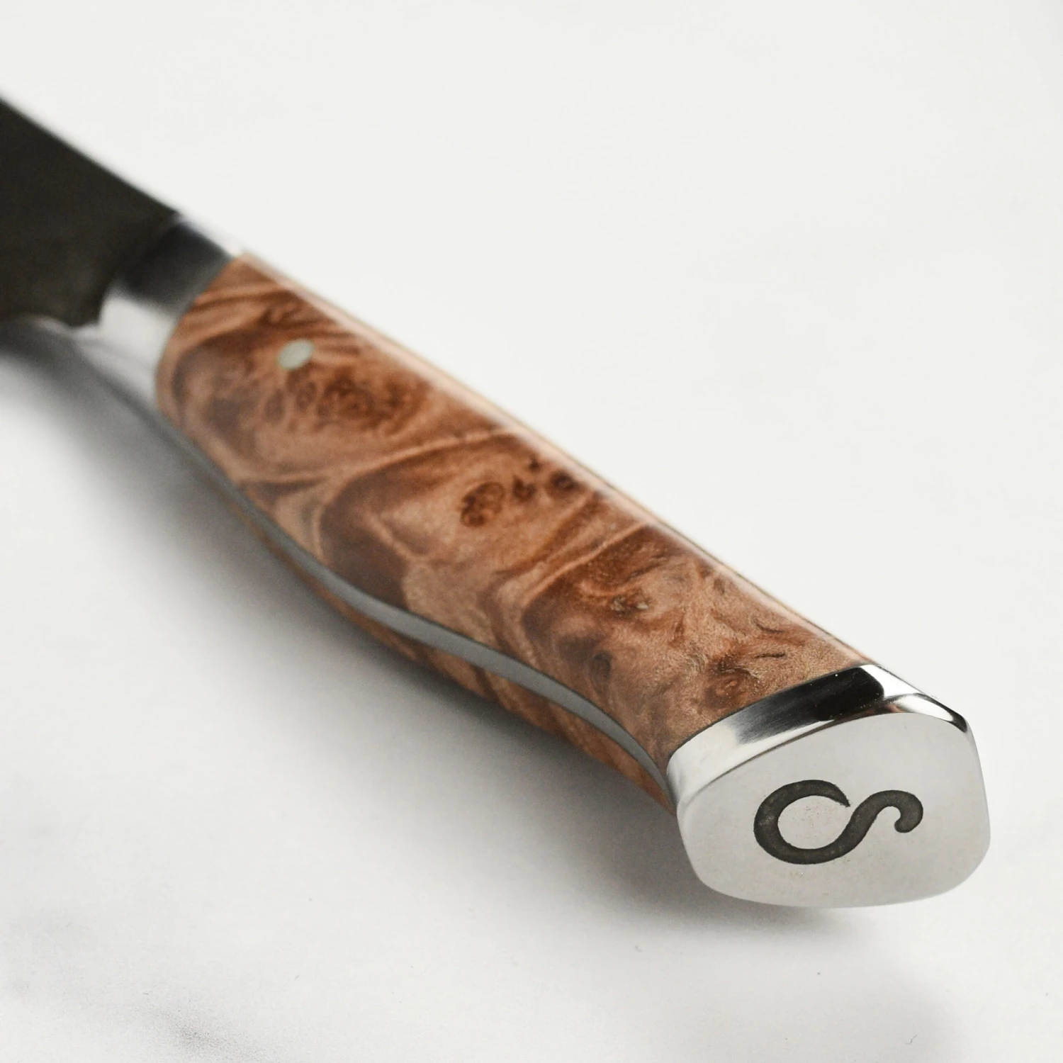 - Half-octagonal top handle shaped with a smooth rounded base, constructed of natural wood, locally sourced Oregon Big Leaf Maple Burl; stabilized with resin to meet tough kitchen requirements and prevent shrinking or swelling; integral end cap with engraved Steelport logo
