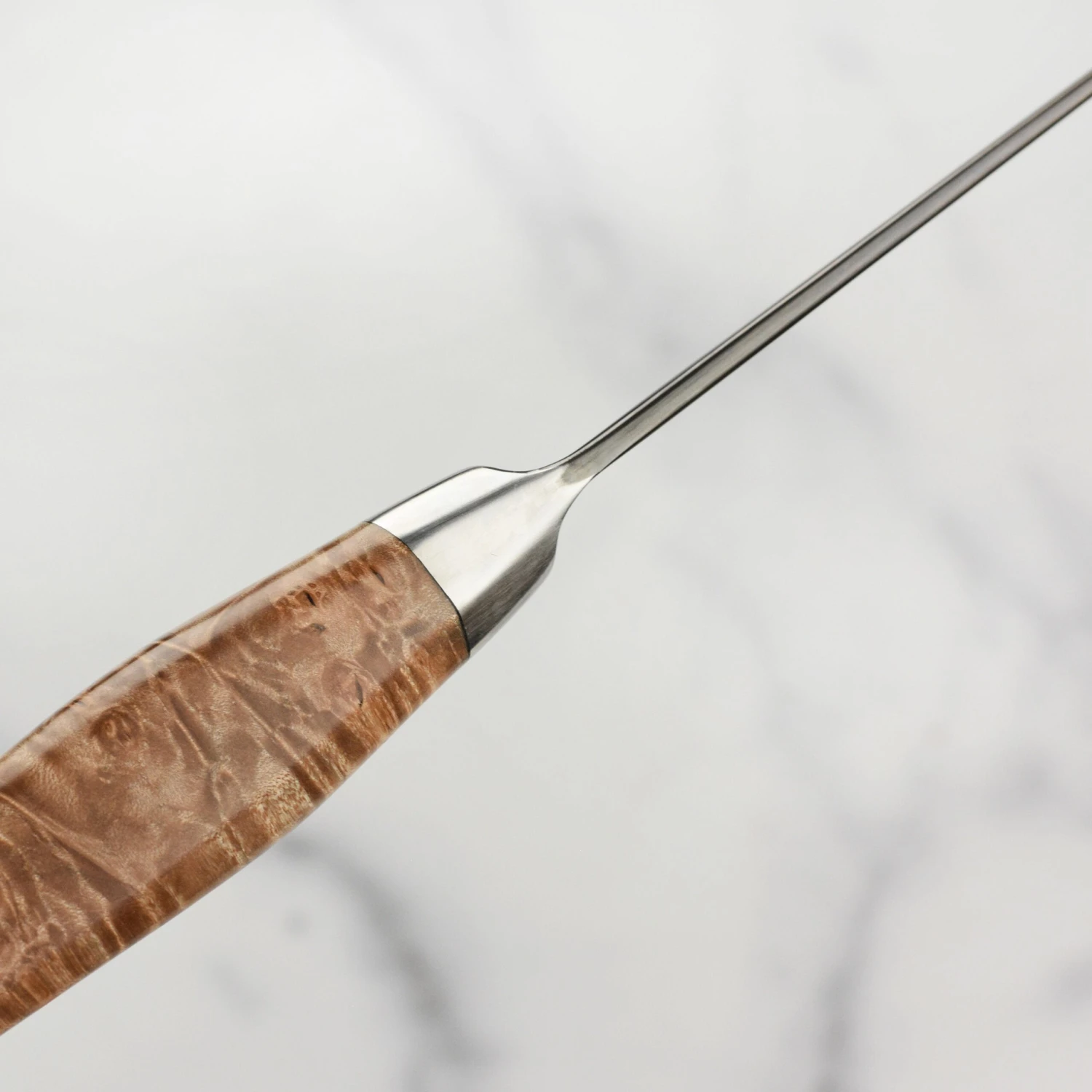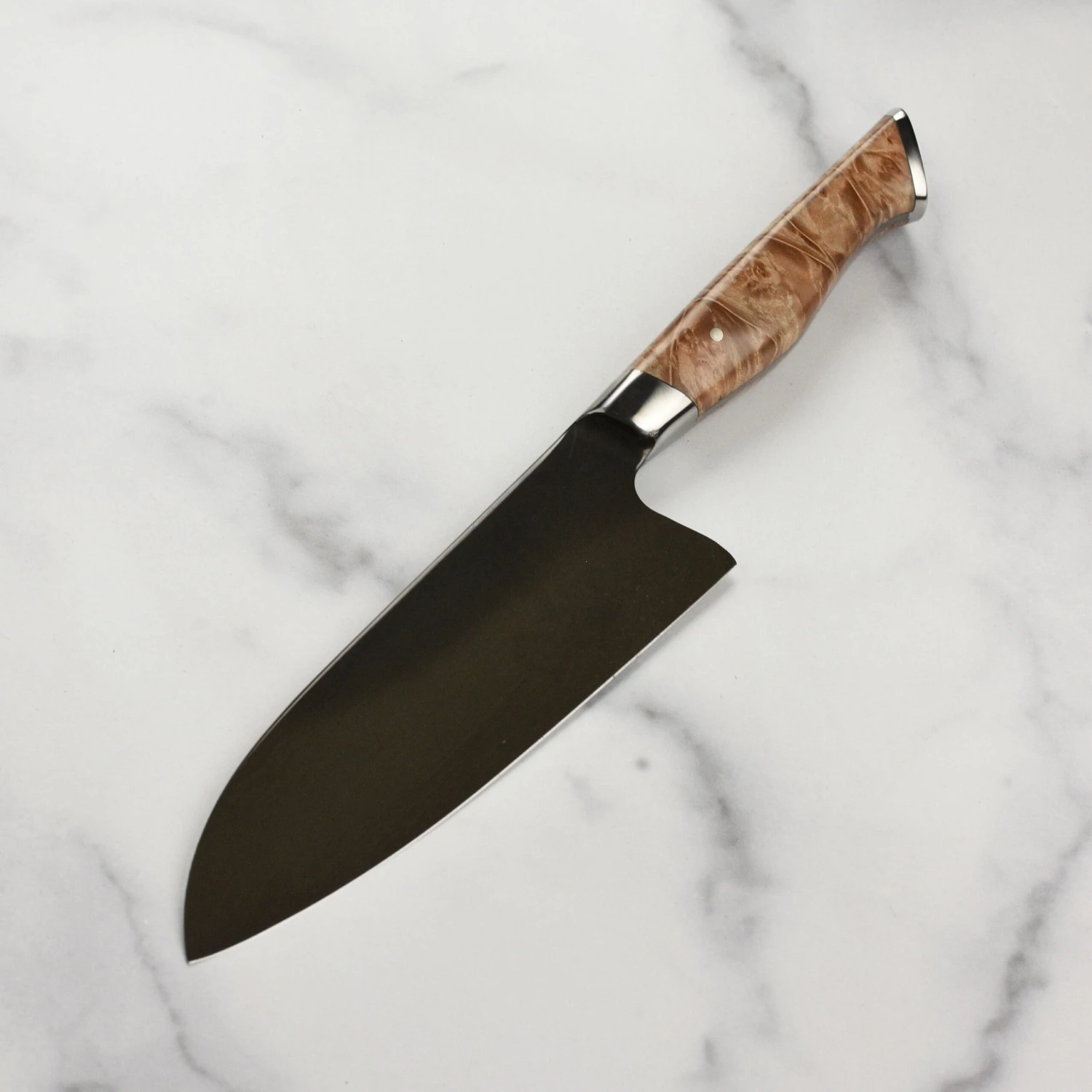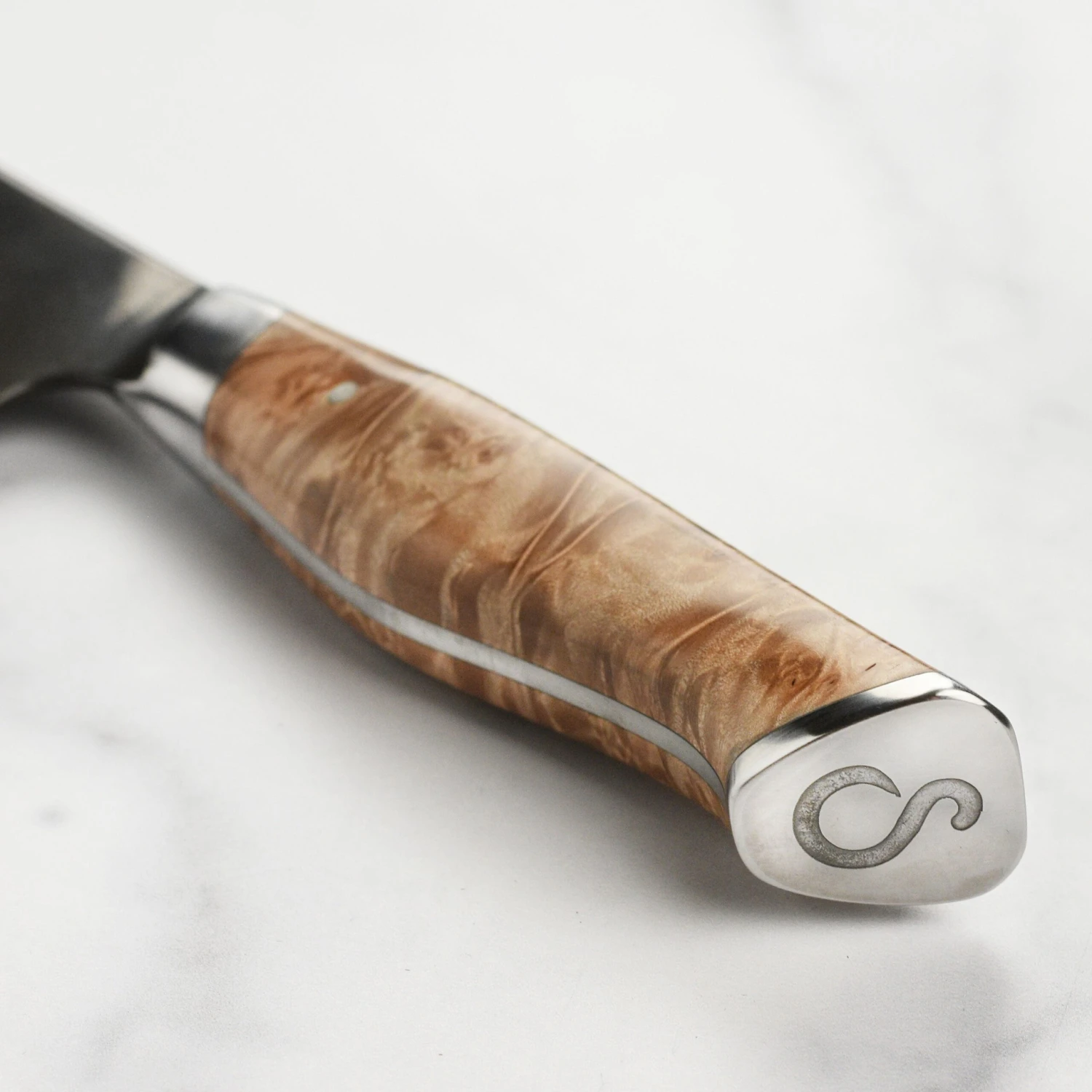 - Half-octagonal top handle shaped with a smooth rounded base, constructed of natural wood, locally sourced Oregon Big Leaf Maple Burl; stabilized with resin to meet tough kitchen requirements and prevent shrinking or swelling; integral end cap with engraved Steelport logo