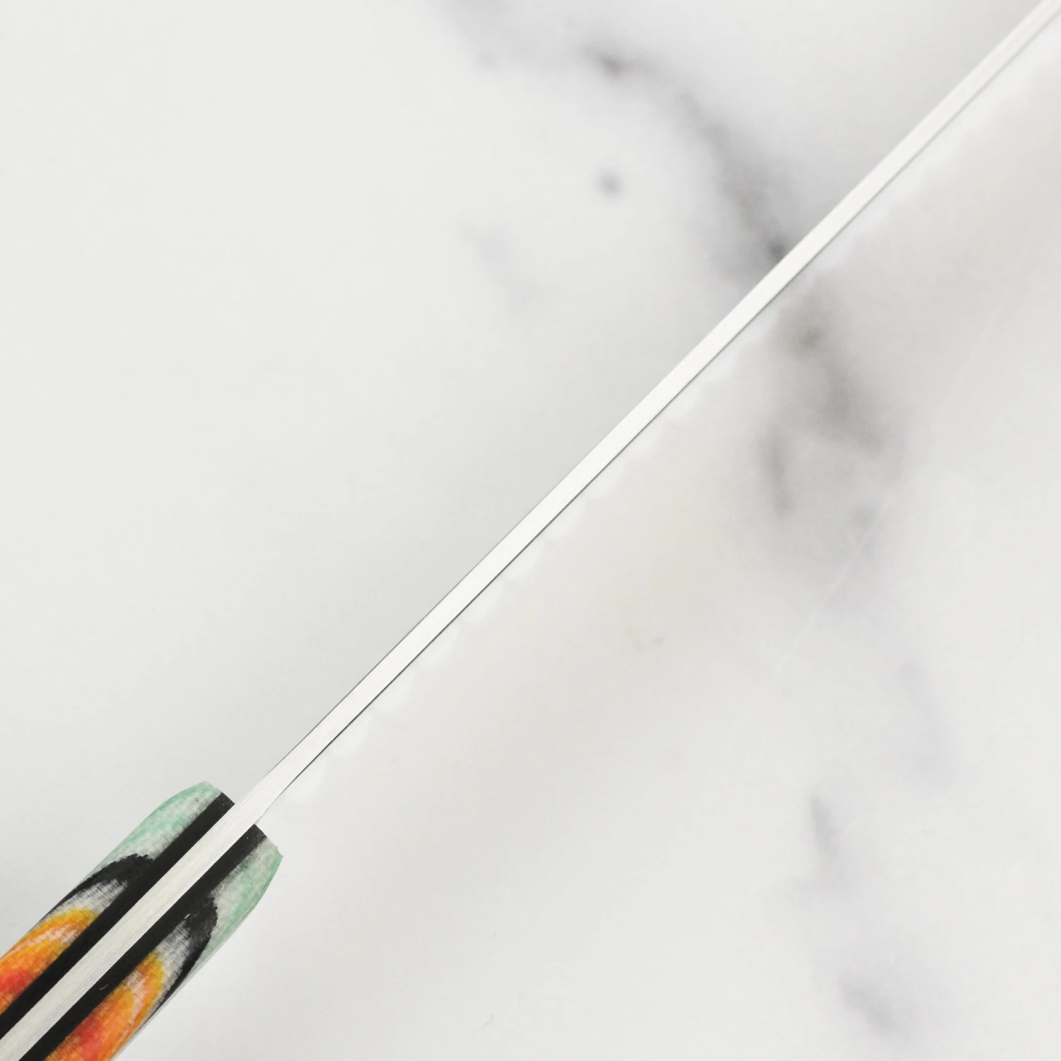 - Pointed tip, straight spine, and thin sharp serrated edge slices food effortlessly