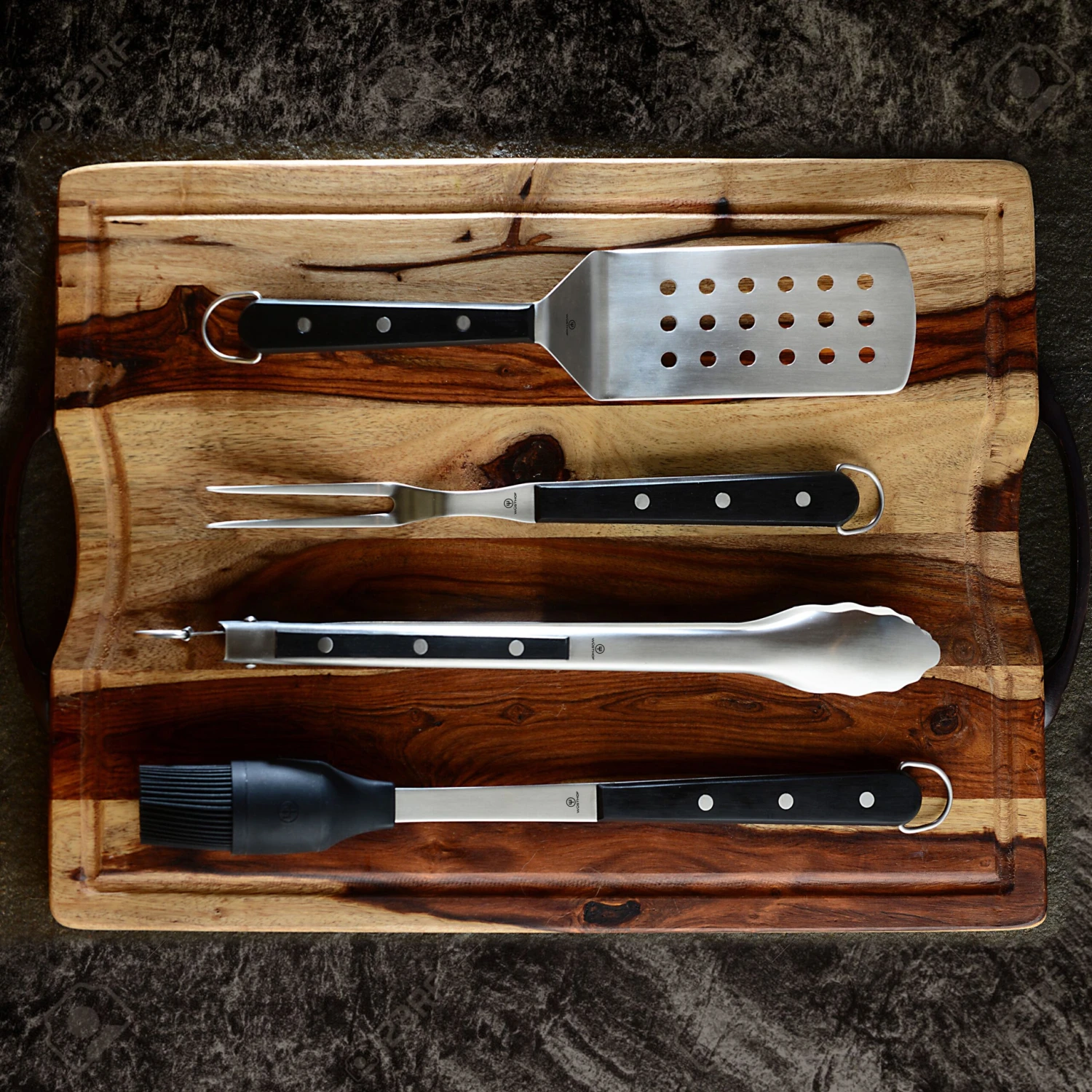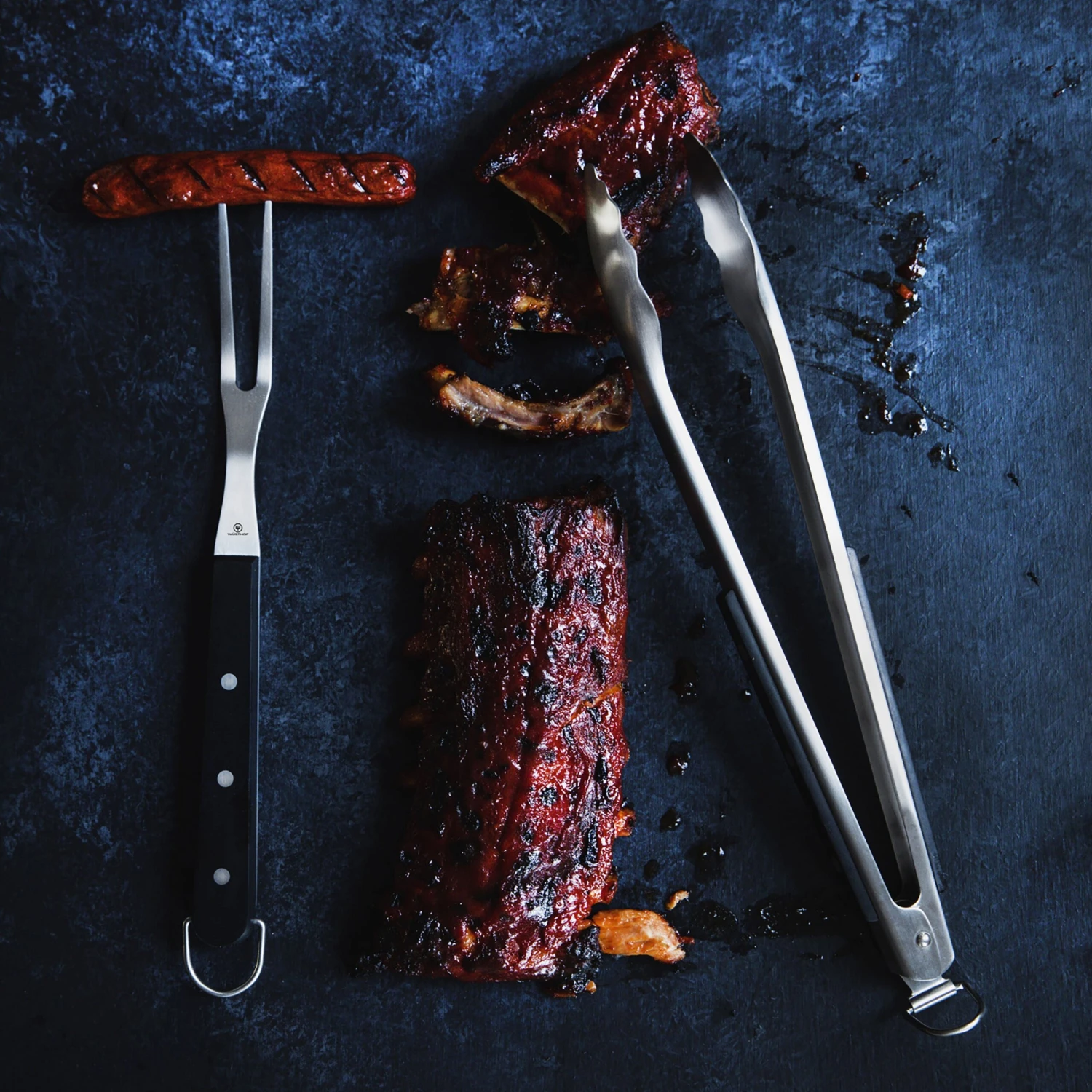 - Features a ring at the end of each handle to hang on grill hooks; built for balance and comfort